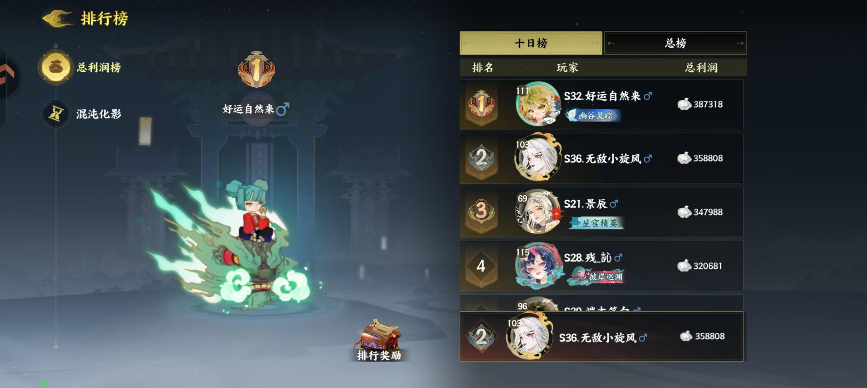 虽然活动没结束,但排名基本已经确定。利润榜10日榜保3争2,总榜保5争3。混沌化影榜单竞争还好,基本能拿到前五的第一档奖励。(只钻石体力买满,没有氪金)