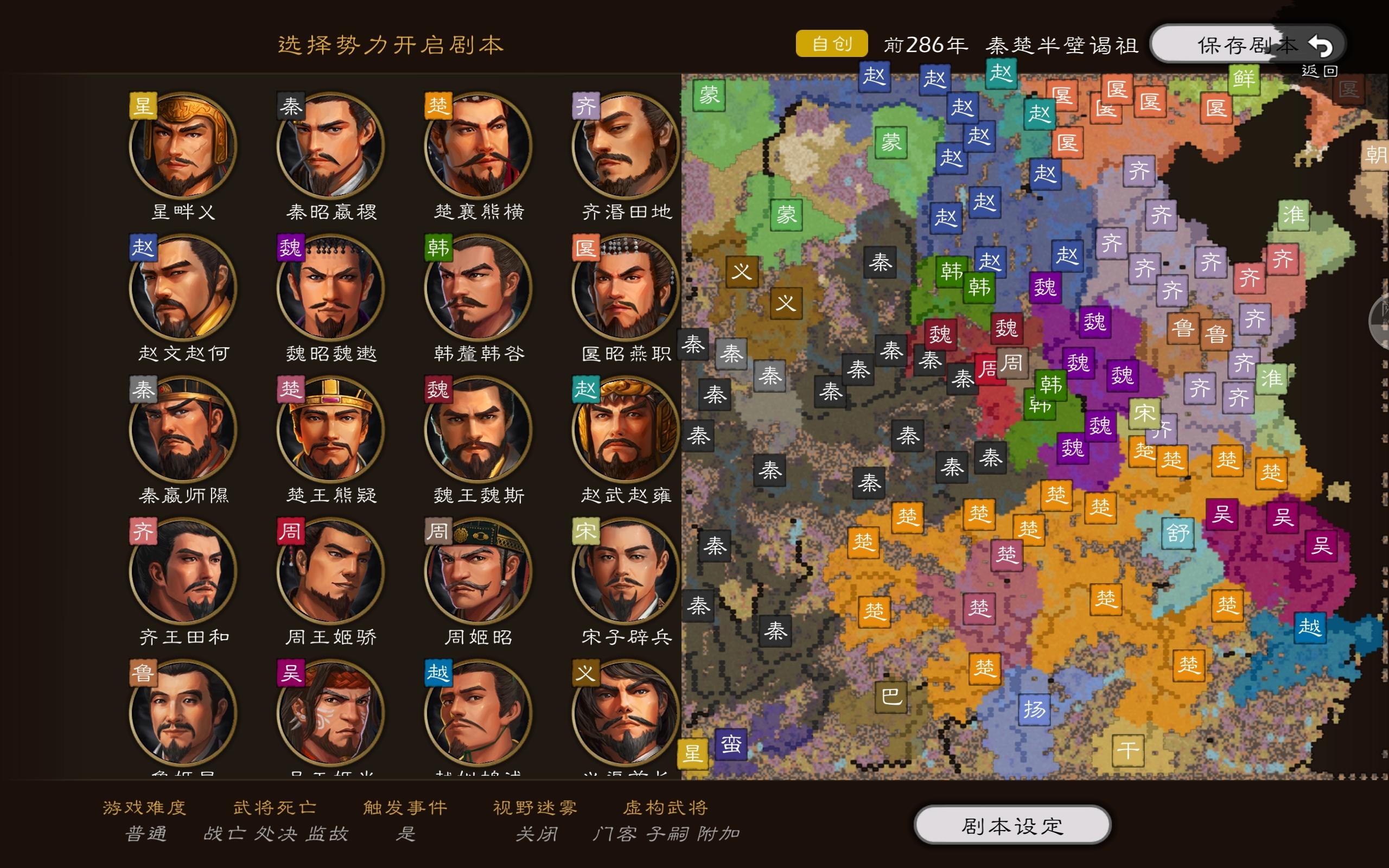 【剧本核心势力】七雄以及他们先祖秦国【嬴稷 昭襄王】豲huan 绵诸 武都 郇阳 商 丹阳 宛城 宜阳 魏 临晋 栎阳 咸阳 高奴 南郑 梓潼 成都 巴楚国【熊横 顷襄王】钜阳 下蔡 钟离 广陵 陵阳 鄂 曾 城阳 番 随 邓 高蔡 獽夷 廪君蛮 上庸 齐国【田地 湣王】平舒 饶安 东武城 高唐 临淄 肥城 莒 郯tan城 邳 彭城 城父赵国【赵何 惠文】屯留 离石 晋阳 邯郸 雁门 楼烦 善无 云中 九原 灵寿【赵+中山】魏国【魏遫 昭王】中牟 濮阳 大梁 睢阳 陈 上蔡 【魏+卫】韩国【韩咎】平阳 端氏 新郑 阳翟匽国【燕职】 武阳 蓟 沮阳 渔阳 无终 孤竹 襄平