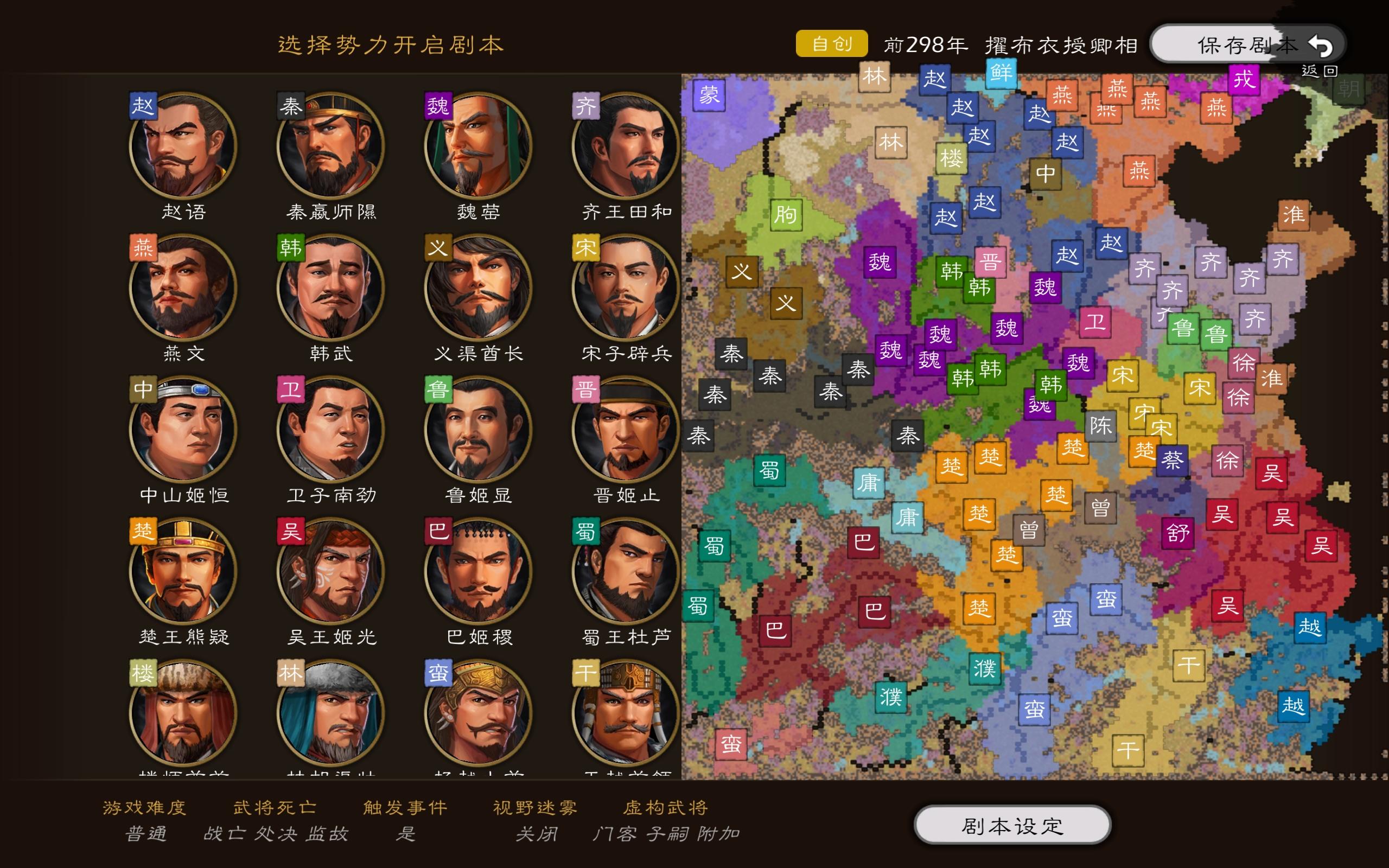 剧本名《秦楚半壁谒先祖》 选用年份在公元前286年。【本版特色是 七雄需要通过试炼,也就是占领他们先祖的地盘,获得势力历史武将以及资源和地盘,大大强化自身。燕国和韩国无有。 或可以选用五大先祖势力,反吞对应势力,再逐鹿天下】