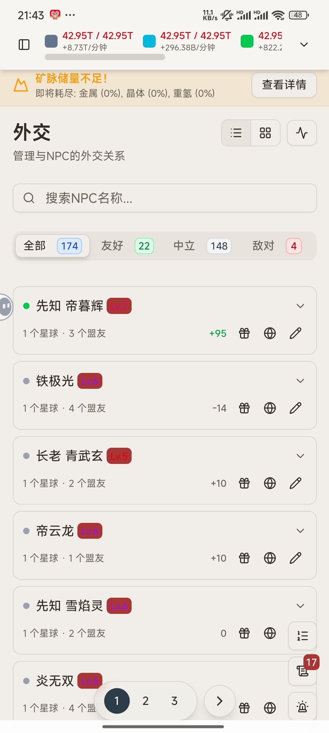 资源这个其实不会太缺,游戏内有10倍资源按钮,打开再升几级矿就够用了,储物罐能升就升,实在受不了就改一下时间,后面限制升级的主要还是建筑升级时间。探索,回收残骸等杂七杂八的加起来也没多少资源。盟友在你缺资源时也会送资源,储物罐容量越高送的越多。给盟友送礼有概率不收,但大多都会收,少部分不收还掉好感。