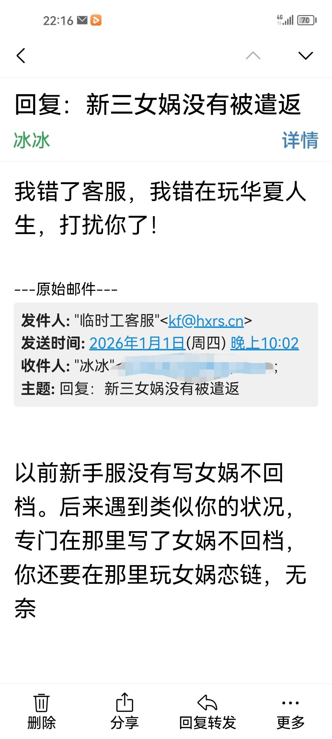 最近两年新手服三不是女娲能回档吗?女娲不是不能去别的女娲家存档吗?现在飞到已经断档了的旧档老死以后,就每次都在那个档重生了,草帽你们跟我开玩笑呢?给我把档换着玩?新三服女娲都不能重生我也认,给我把档换着玩是个什么事?