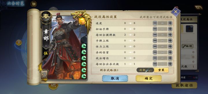 第一步,选章邯,6合界面加属性,优先速度至少4,其次2摸牌2杀次数