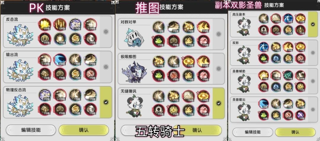 四转以及之前,骑士很特殊,基本上没有固定搭配,没有答案可以抄,骑士的技能搭配都是小combo组成的,所以在看骑士的时候,需要去看combo学习思路,而不是硬抄答案。答案是不固定的,是灵活的,骑士可以随意调节自己的坦度和输出。