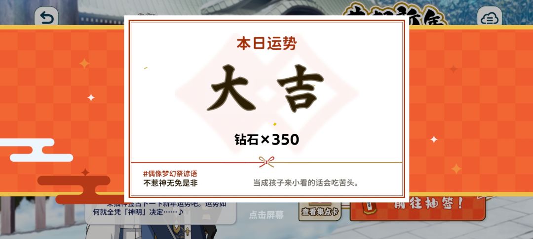 ↓游戏内【恭贺新年!抽签】页面显示如下,点击抽取吉运吧!↓