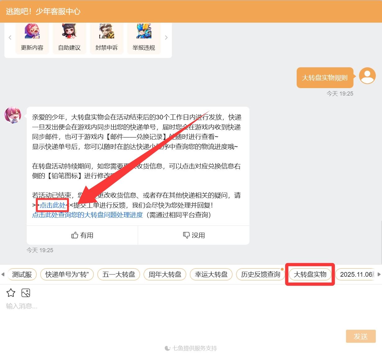 若活动已结束,如需修改收货信息或有其他快递疑问,可通过游戏内右上角【客服】-【大转盘实物】提交工单反馈,我们将尽快为你处理。