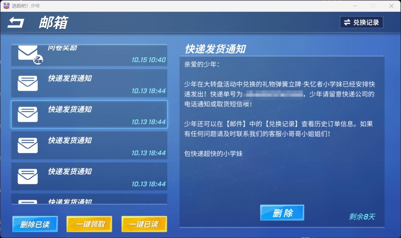 大转盘实物将在活动结束后30个工作日内陆续寄出。快递发货后,物流单号会同步至游戏内,并通过邮件发送给你。你也可以随时在游戏【邮件-兑换记录】中查看最新状态哦。