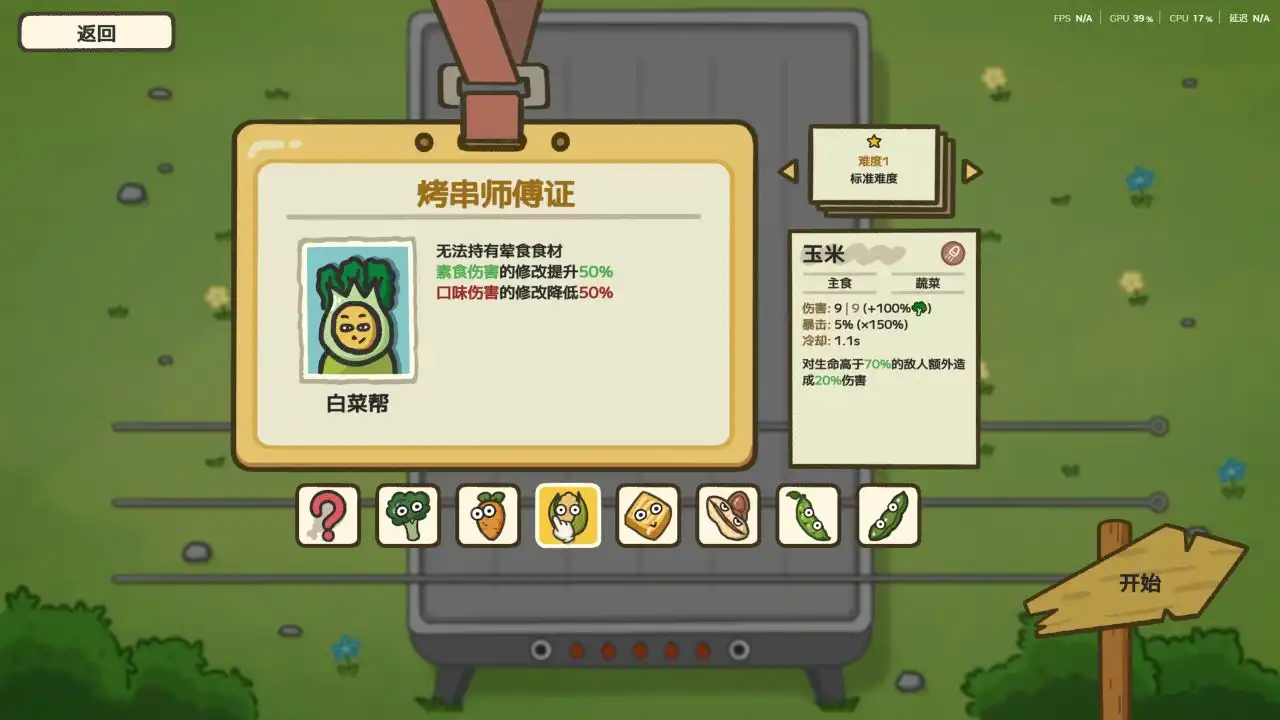 游戏整体的画风是简洁的动画简笔画风格,看起来非常舒服,美食们的形象也非常可爱,开局我们需要先选择拥有不同的烧烤特长的烧烤师傅,每位烧烤师傅都拥有不同的加成和风格,对应到游戏中就是各种不同的流派,并从众多师傅擅长的食物种类中选择一个作为我们的初始道具。
