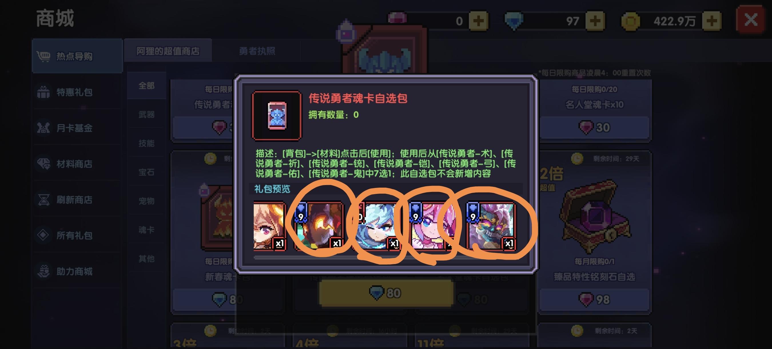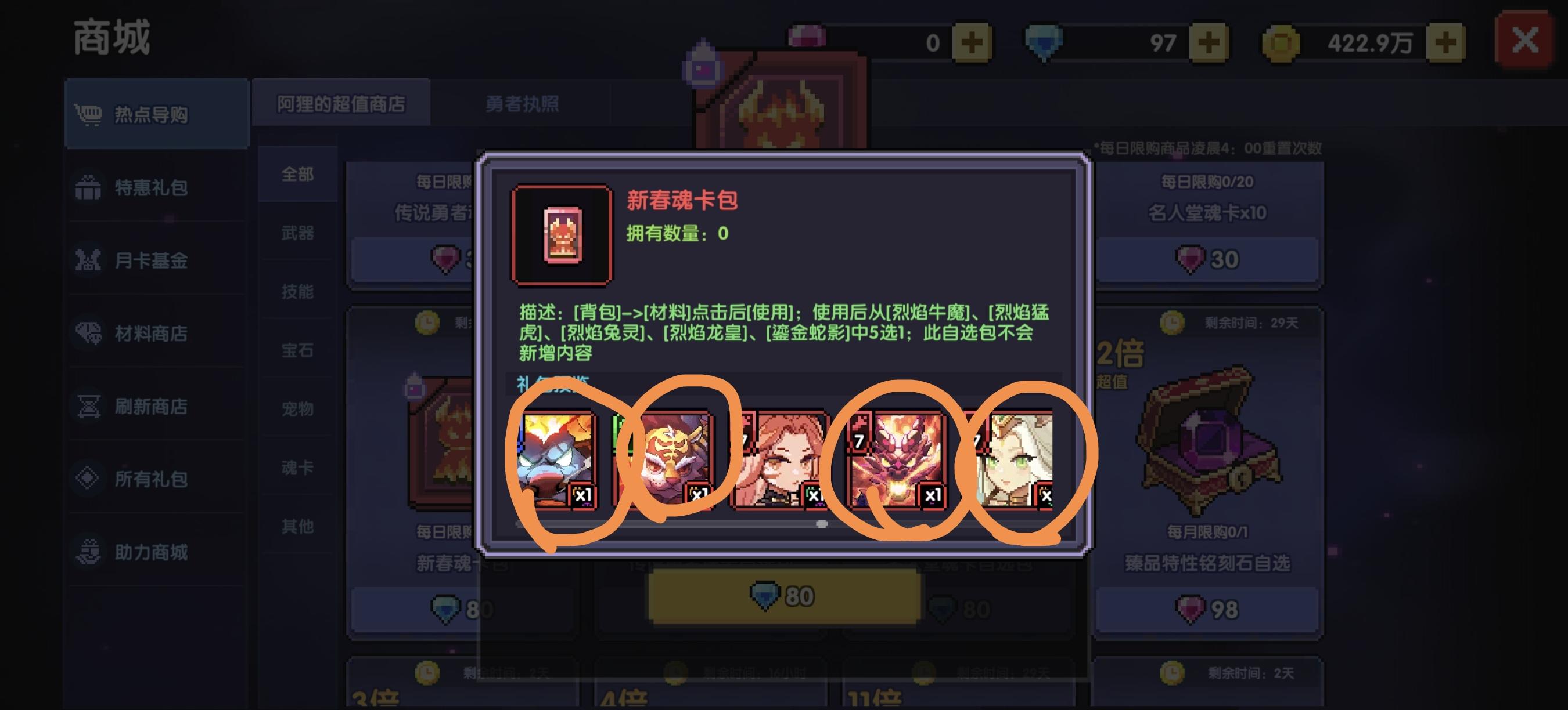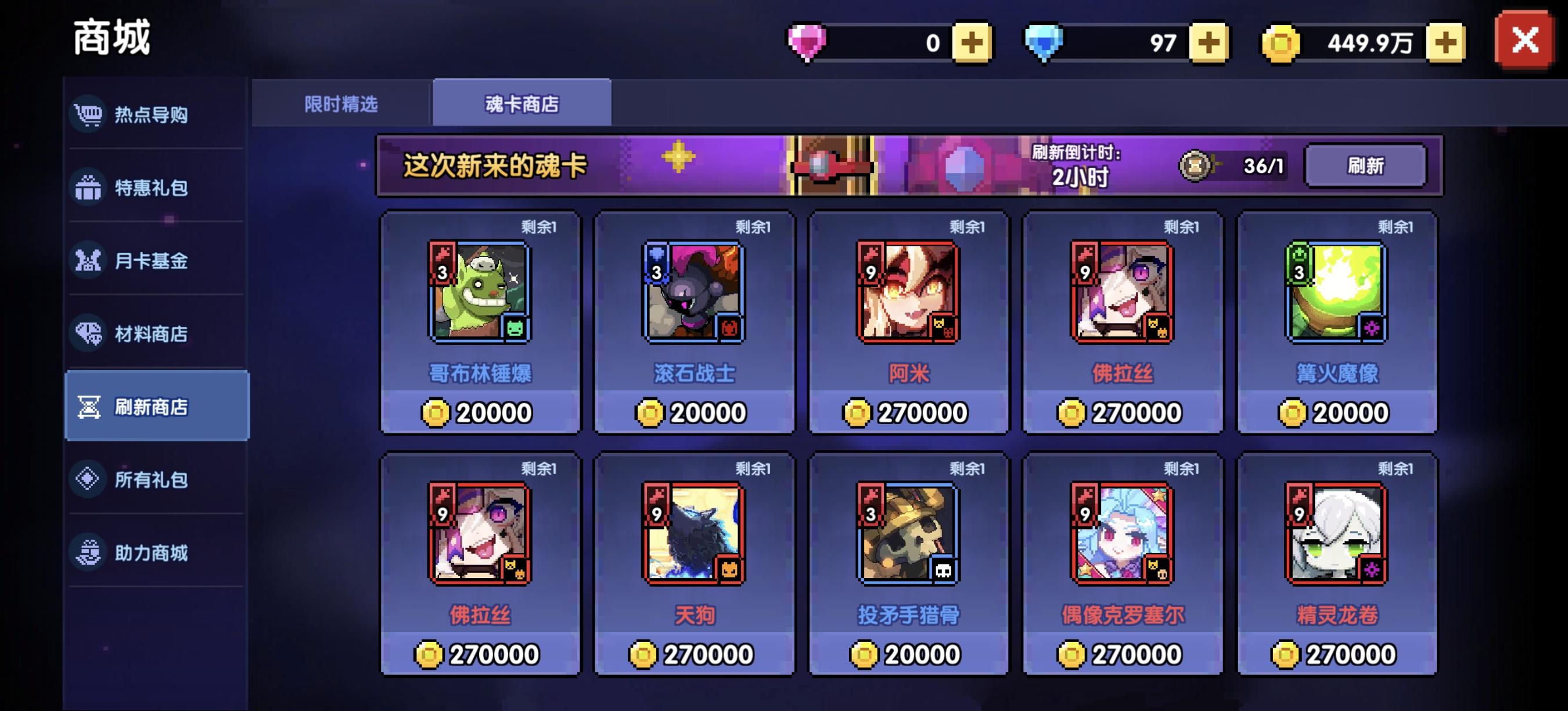 然后新手注意一下魂卡商店,这里面有一张卡叫偶像克罗塞尔,如下图第二排第四张。这张是魂卡商店中最有用的卡,别的魂卡都没有用。这张可以考虑购买。爆伤主词条才有升级意义,不然浪费升级的魂力资源。