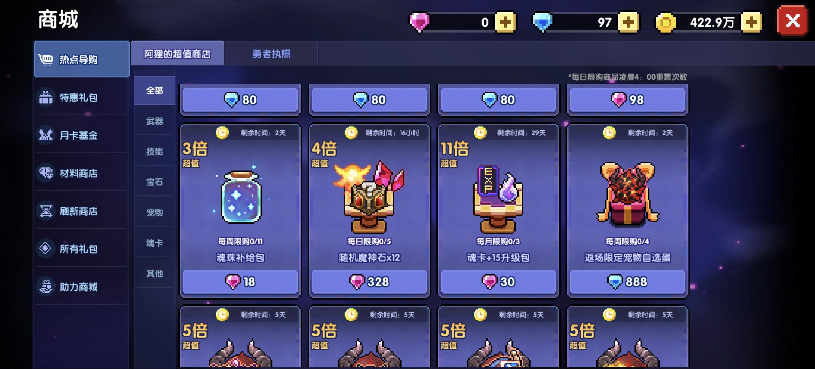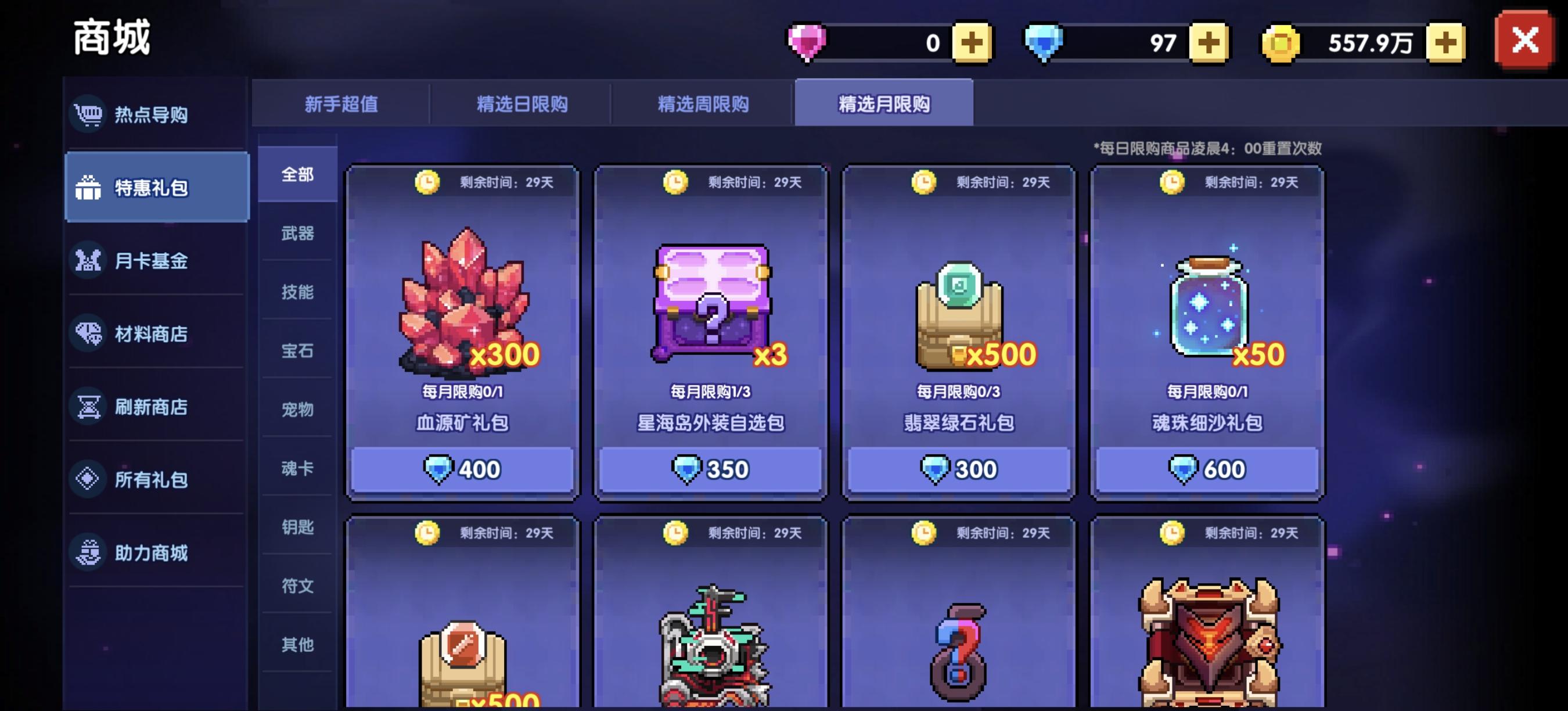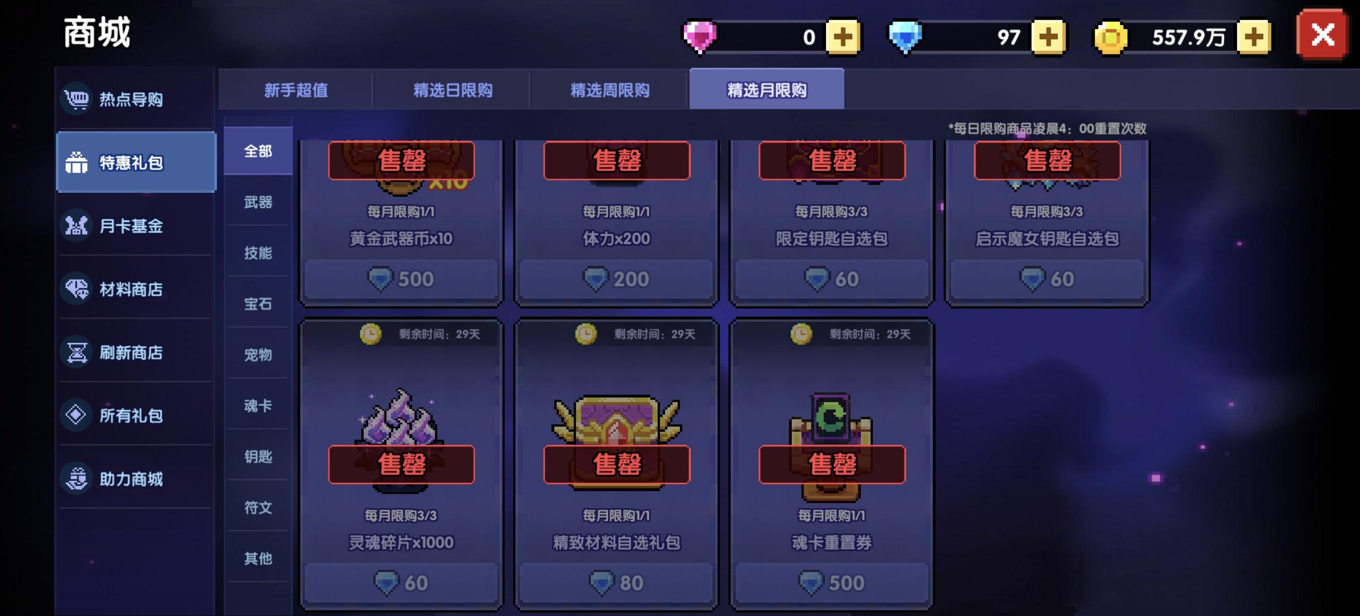 剩下的月限购商城中,魂珠细沙>魂卡重置卷>血源矿>武器币,这些可以酌情购买。
