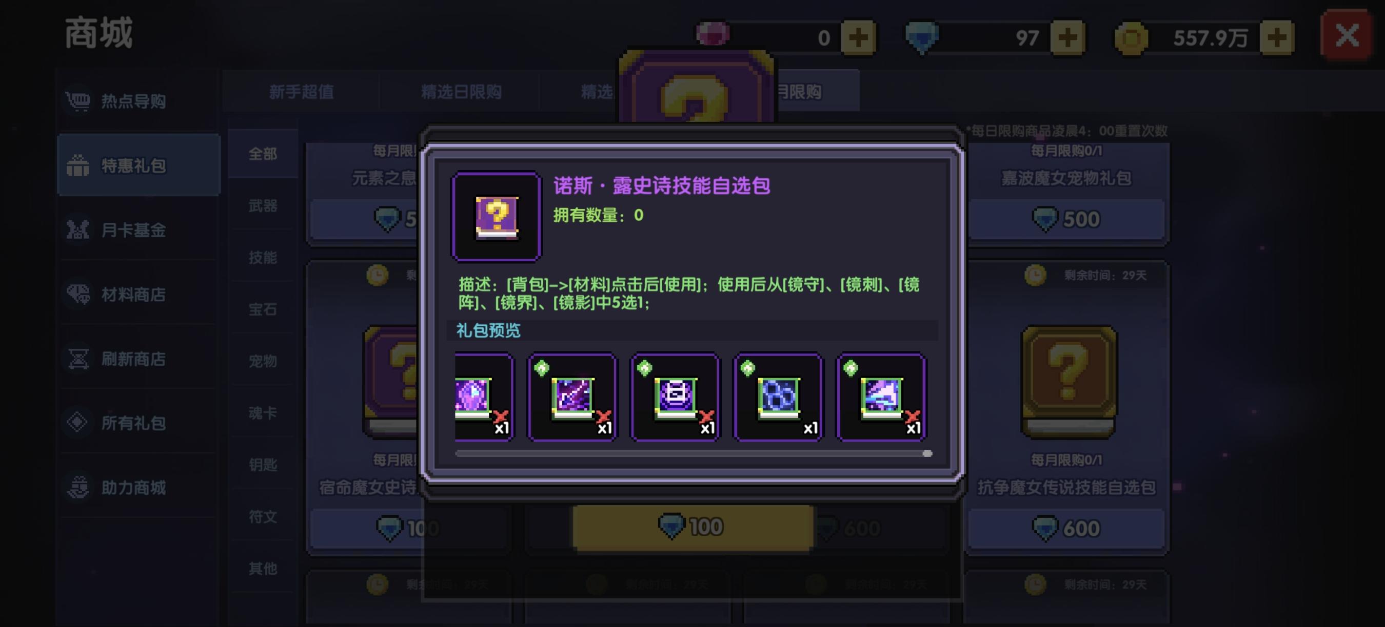 抗争魔女史诗技能自选包。这里注意是史诗技能自选包可以买,传说技能不太值,牧师玩家商城如果刷不出来境界技能,自选包100钻石可以开出来 很值!