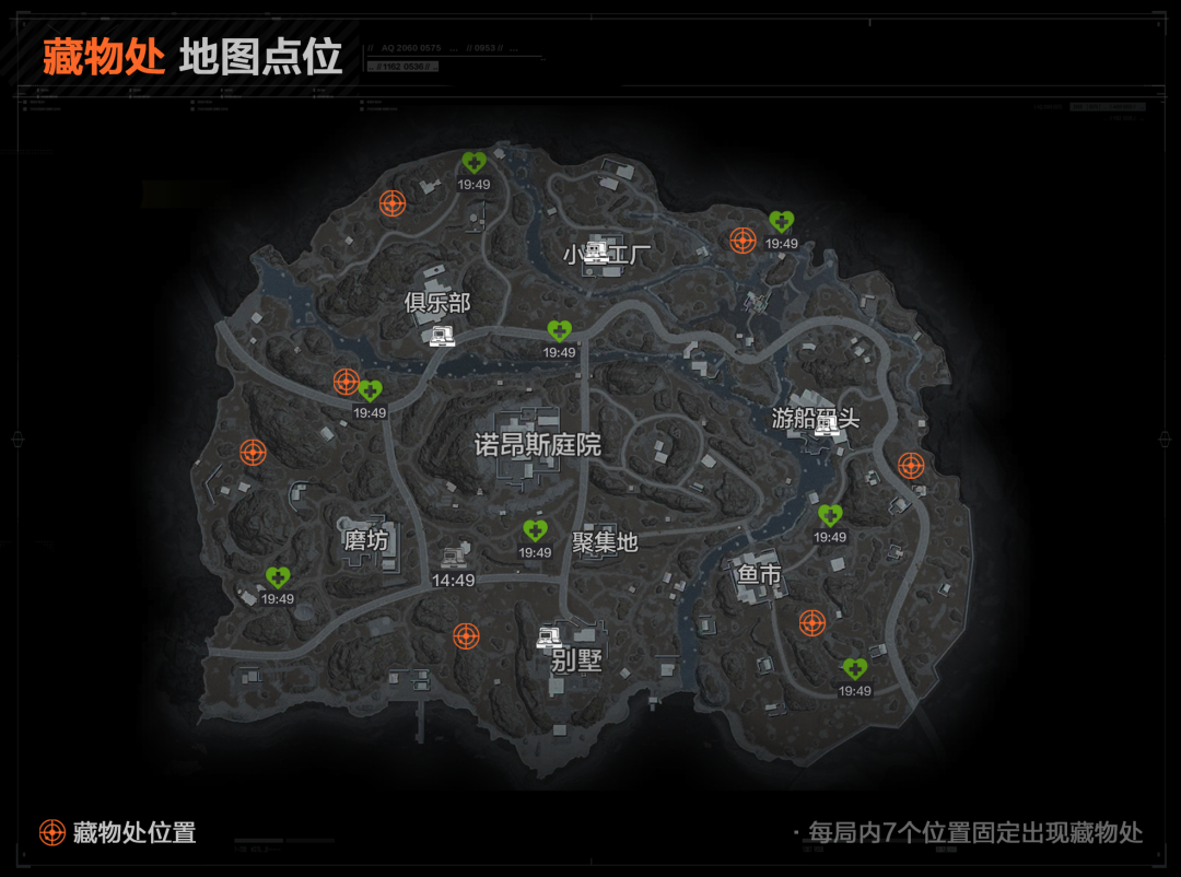 全图总共有7个隐蔽的藏物处,这7个藏物处的位置是固定的。藏物处是一个隐秘的树洞,对准树洞即可搜刮容器。在藏物处周围时可以听见松鼠的叫声。