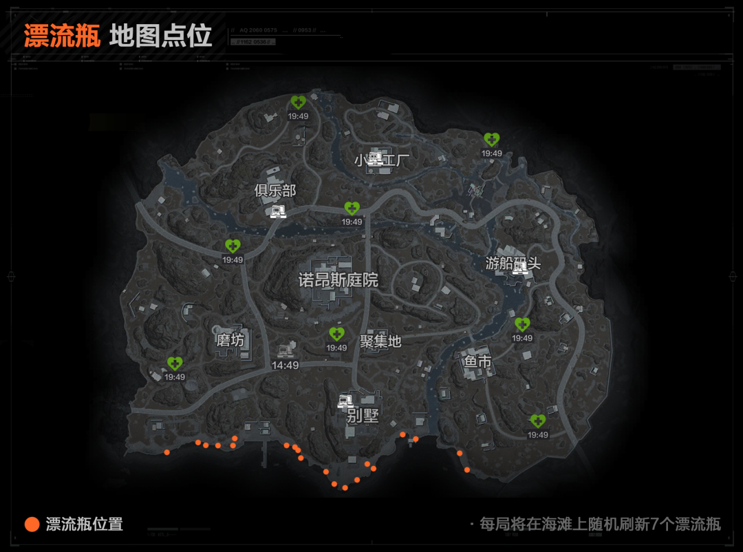 漂流瓶只会在海滩上出现,每局都将在海滩上的随机位置刷新7个漂流瓶。