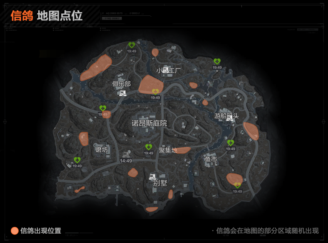 信鸽会在地图的部分区域内随机出现,击落信鸽即可搜索物资。在信鸽周围时会听见鸽子的叫声,可以帮助先锋确定信鸽的位置。
