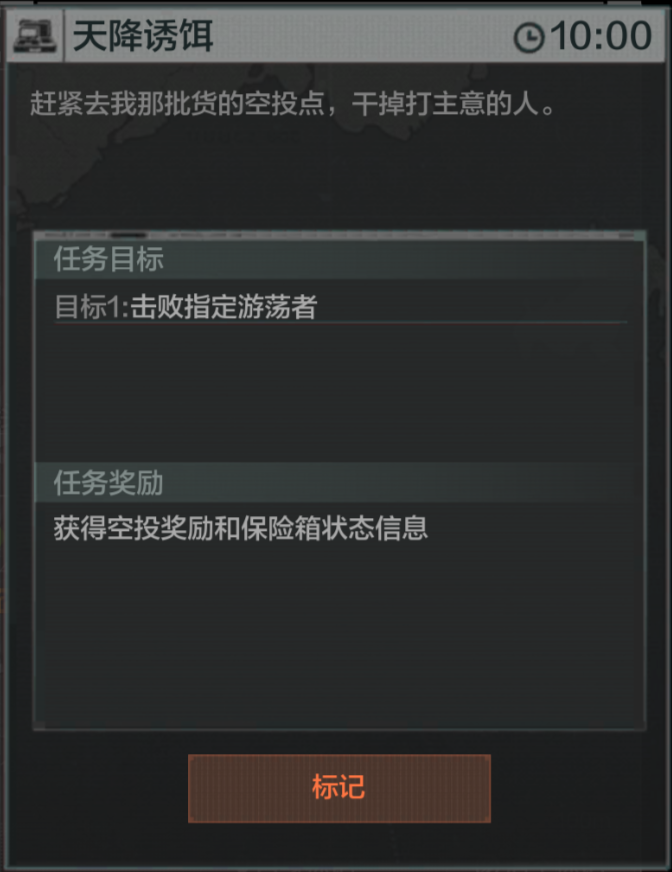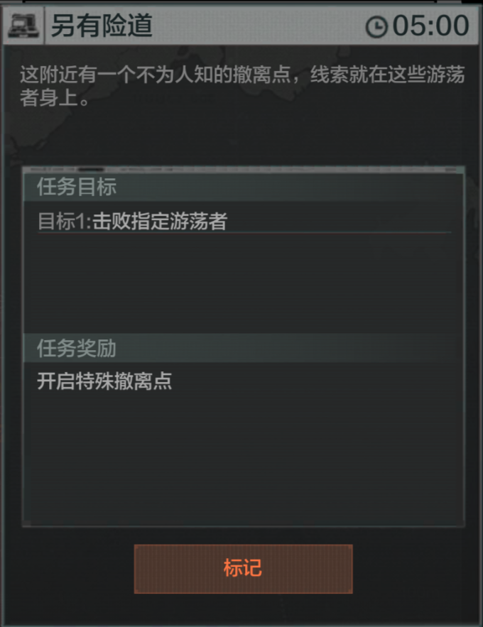 该任务的终端机将固定出现在磨坊东侧,该任务在对局开始15分钟后才能接取,在完成任务后会开启一个新的撤离点。