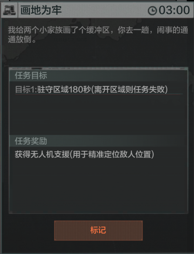 该任务需要特遣队员们在原地坚守三分钟。坚守时需要至少有一名小队成员留在区域内,否则任务将失败。期间会有敌人袭扰,先锋需要击退这些敌人。