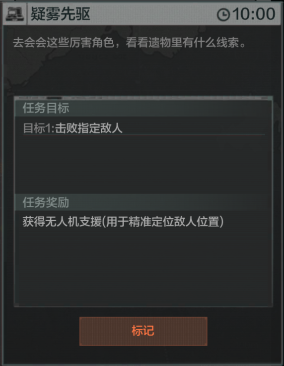 在完成任务后将会获得无人机支援,无人机会扫描一次全图所有其他特遣队员的位置,并在地图上标记20秒,该标记为非实时标记。