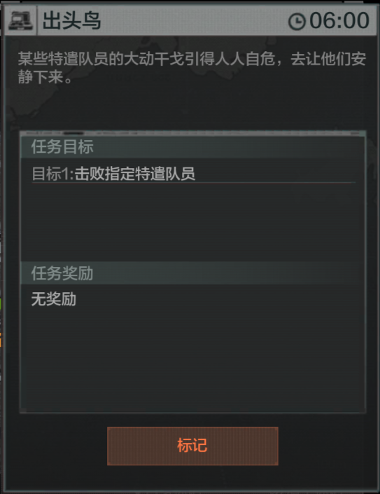 但是在接取任务后会实时显示出当前对局内击杀数量最多的一名特遣队员。但是特别注意!定位显示将是双向的,当你接取任务之后,你的所有小队成员位置也会实时暴露给目标。如果没有符合条件的特遣队员,任务会自动完成。