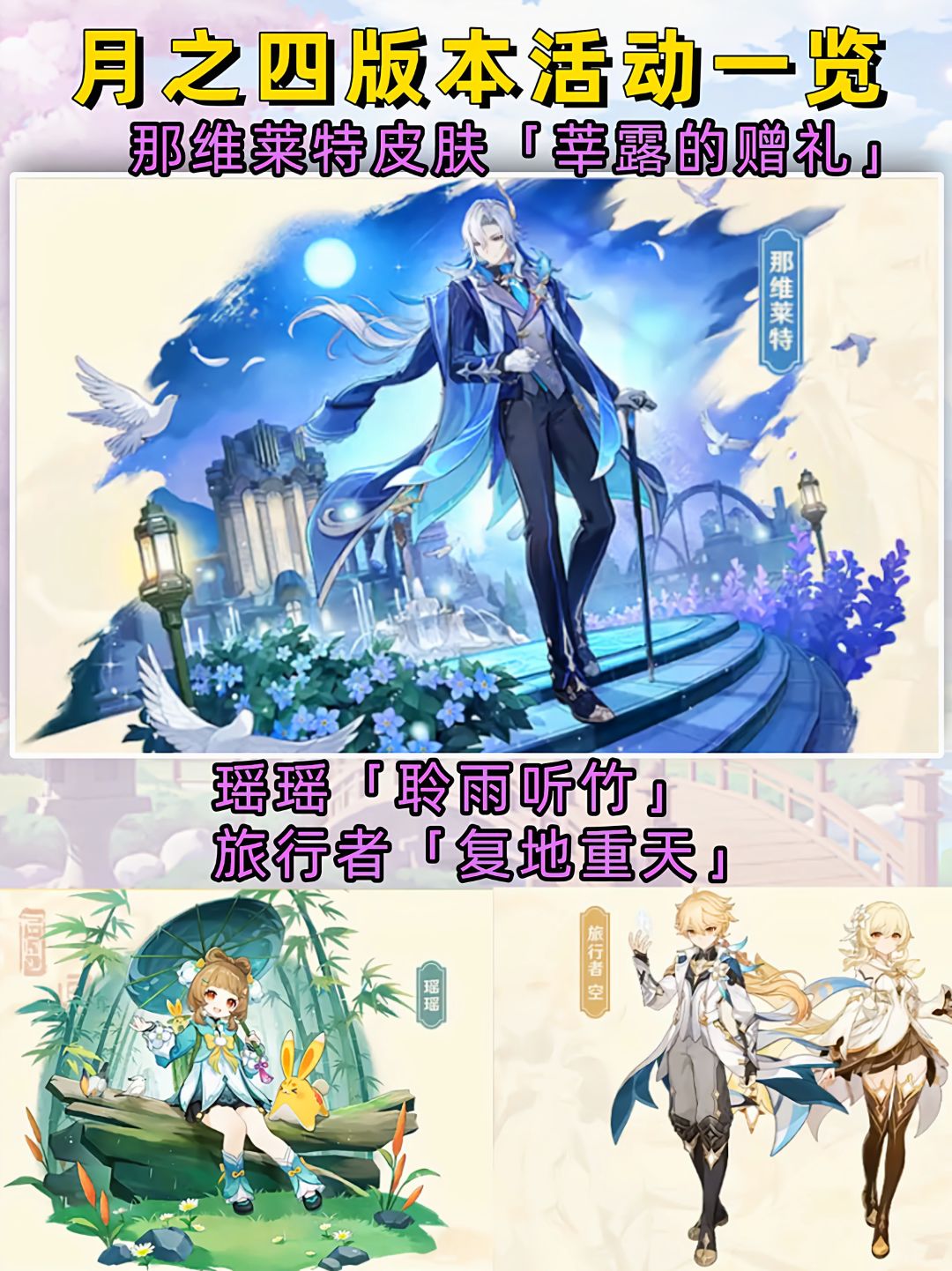 10,新皮肤:龙王莘露的赠礼(商城结晶购买),旅行者复地重天(剧情解锁),瑶瑶伶雨听竹(海灯节大活动赠送)