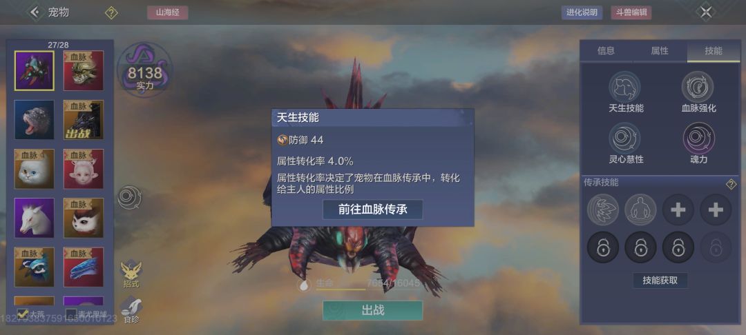 昨天提到的八百年的沙螽,就是天赋差(防御44点),其他方面都还不错,食珍吃的鳄鱼皮(好弄)