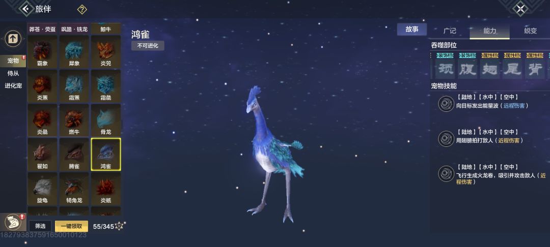 还有另外三个(鸿雀、夭蛄、蝠凤)空丹蜕变的零天慧技能的野宠,等我抓到蛋再看看天赋、魂技孔、食珍这些情况