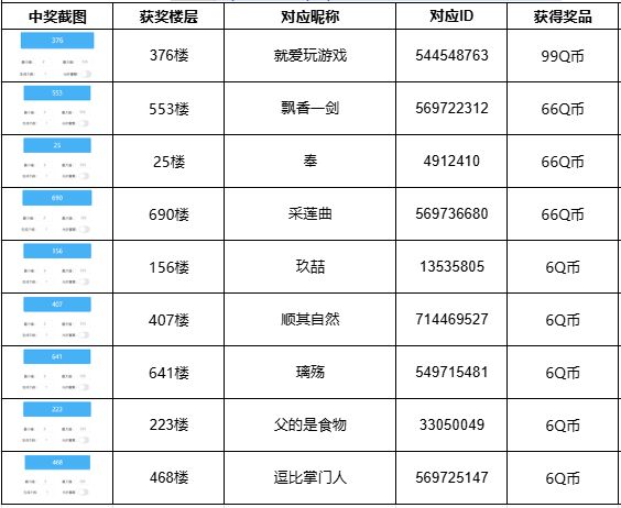 活动截至时有效楼层为2-725楼,经随机数抽取获取获奖楼层和名单如下:
