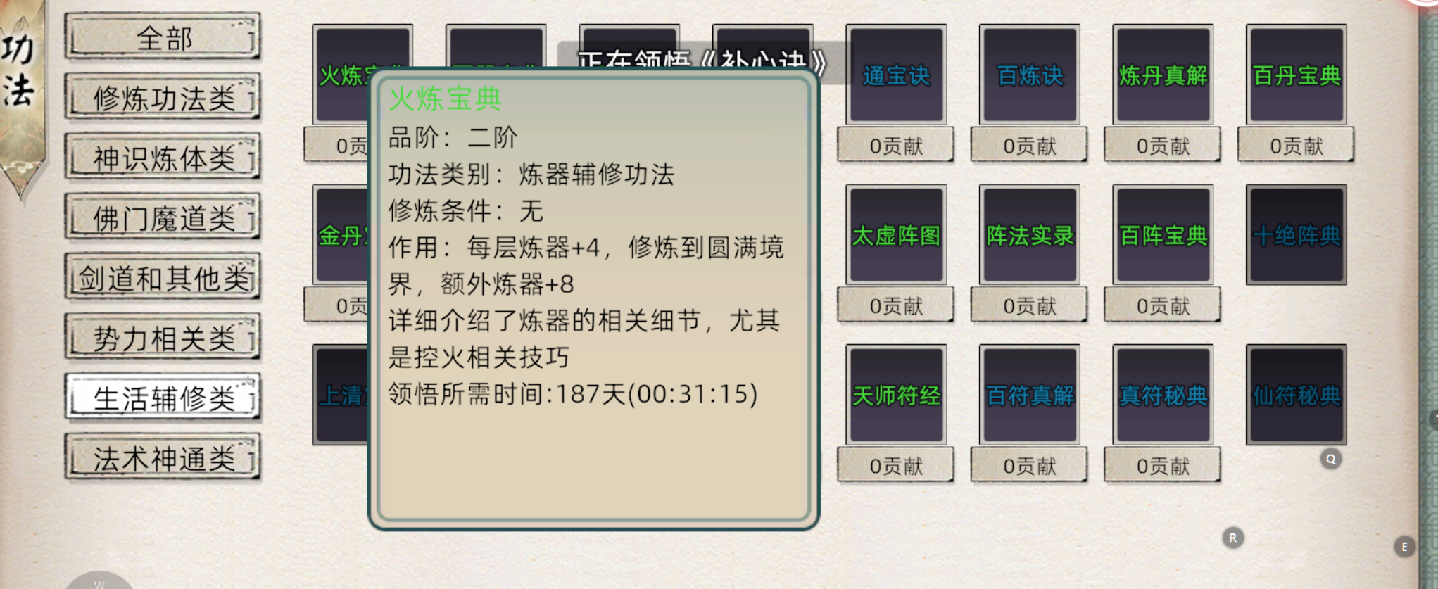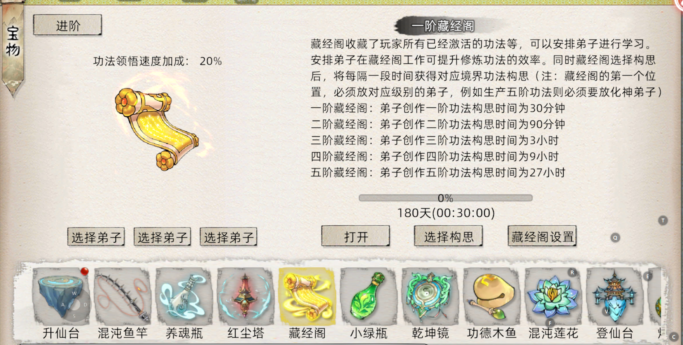 藏经阁设置:设置后的藏经阁可以让弟子满足条件后自动学习该功法/技能