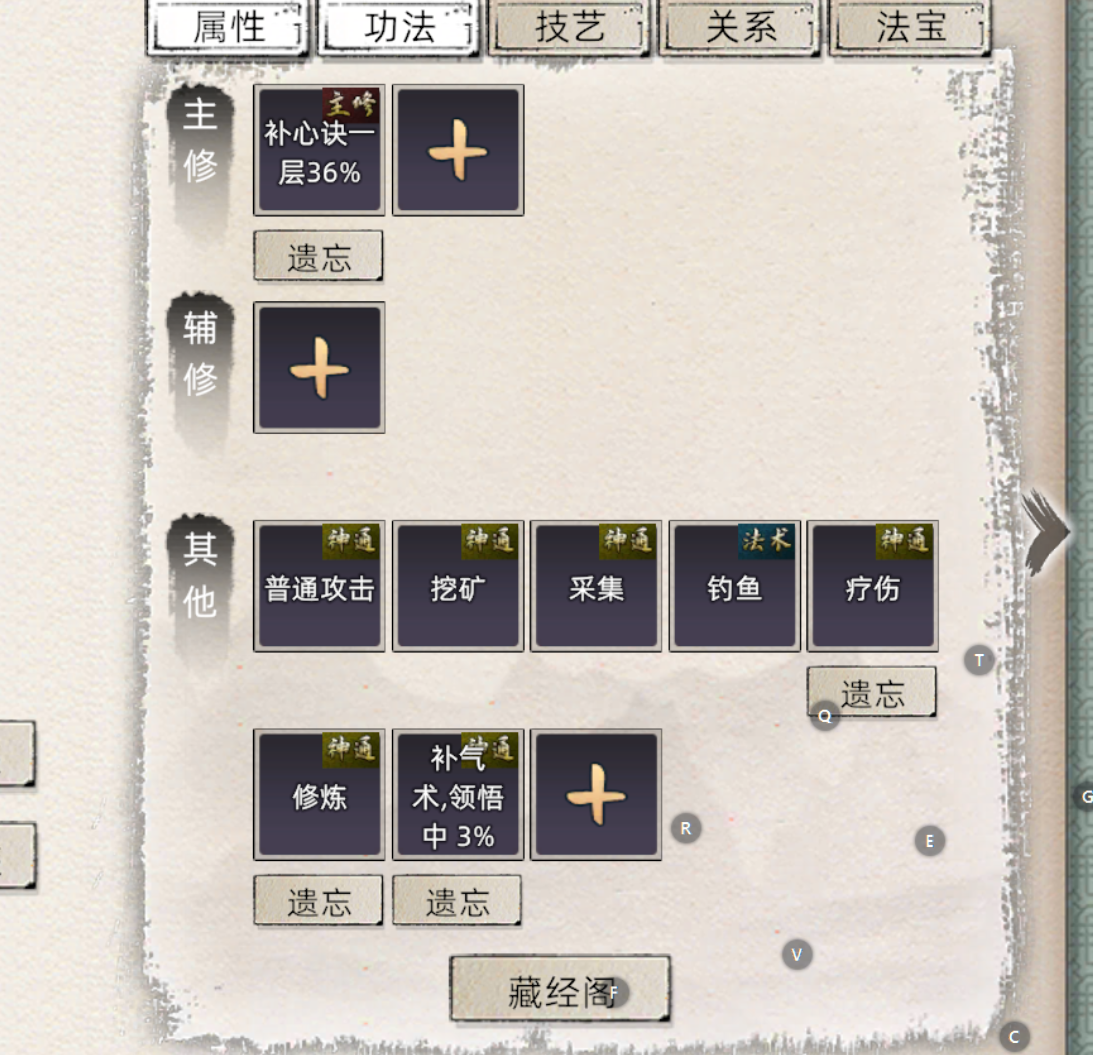 可以简单理解为其他游戏的装备栏,用来装“功法”这一装备。其中主修最多3、辅修4、其他无限
