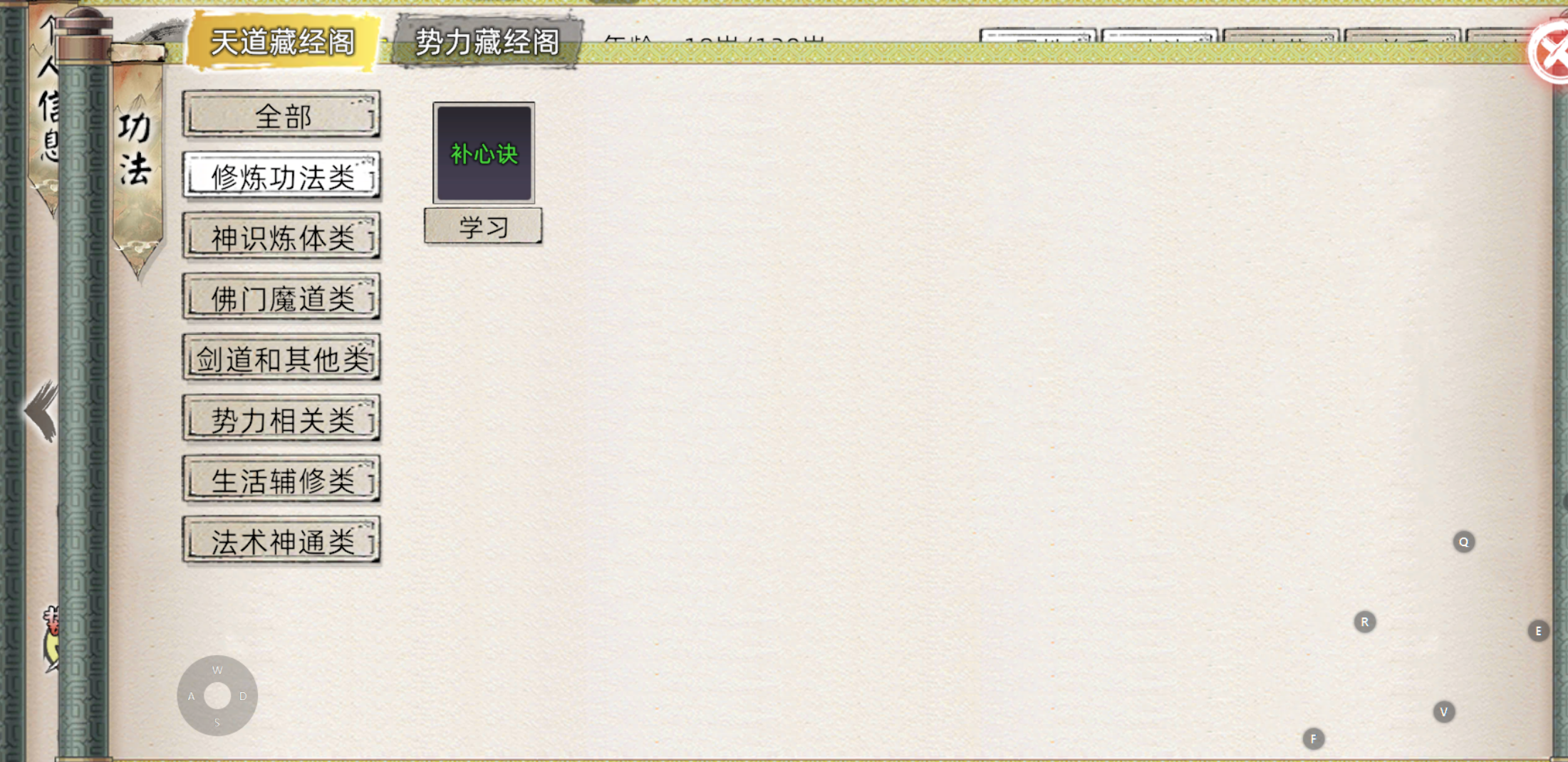 在学习栏可以看到这里的功法有很多种分类,其中开头的修炼、神识炼体,正好对应突破大境界要求的法神血上限,虽然是这么对应的但大家在上篇应该了解到,术法加的法力还不如体魄,那没找到加法上限的那不如改学练体。然后左上角的天道藏经阁与势力藏经阁,是切换学习自己功法和宗门功法的按钮。