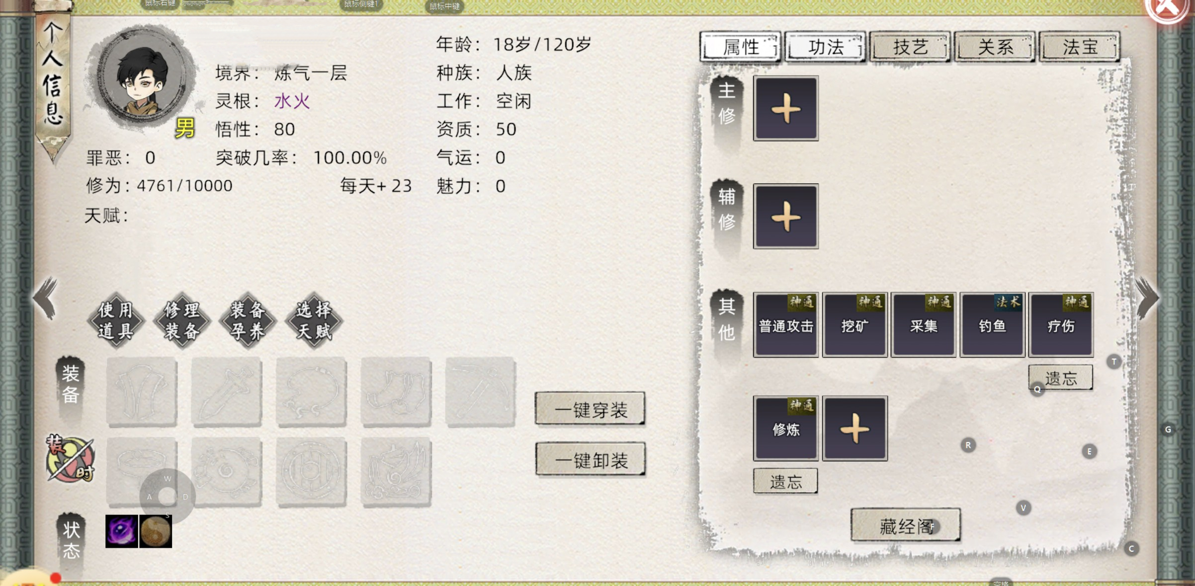 本游戏的功法,你可以理解为其他游戏的一种装备或者说铭文、宝石之类的东西,用来提升一些自己的属性,但区别在于这里的功法和技能进行了关联,如果你没有功法,那代表你没有技能,打游戏没技能难受程度可想而知。