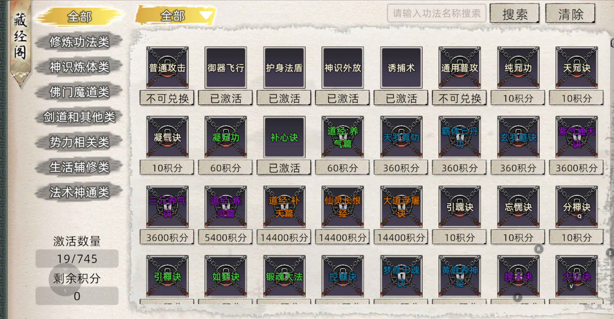 打开:就是游戏的功法图鉴,长按可以查看详细,在这可以通过积分兑换该功法或者一些独立技能。