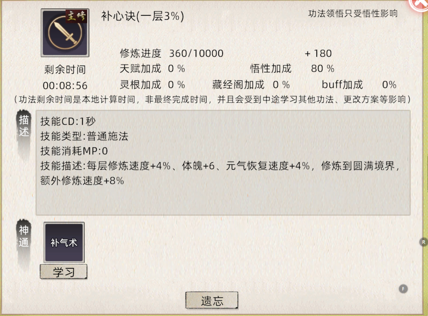 学好后在功法界面点击补心诀,可以看到其关联的技能补气术,以及学习该功法的时间、描述、时间计算加成,在右上角调整修练优先级(停止为不修,三阶修满一个约40小时),优先级默认为不修,记得调整为主要/次要才开始学,而绿色及以上主修功法才有功法专属技能。