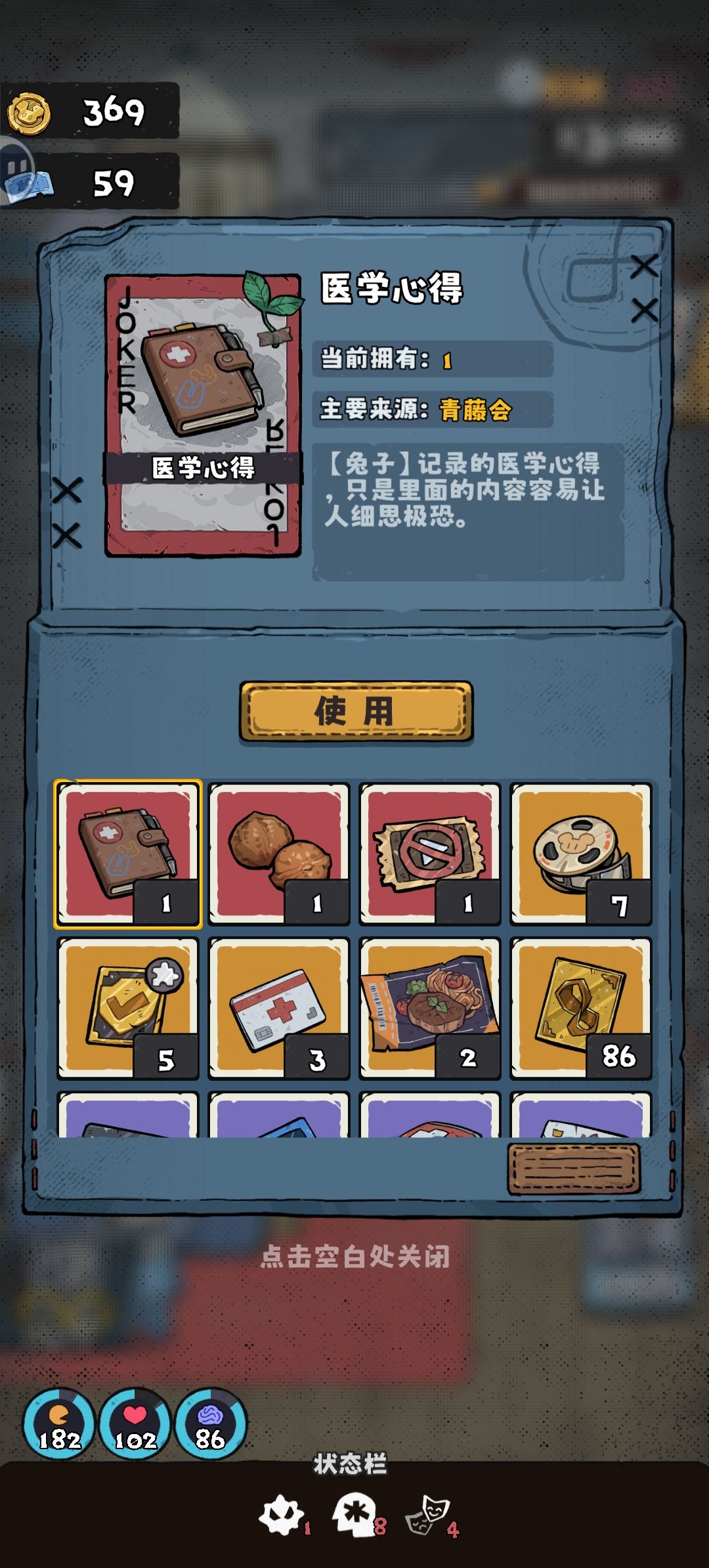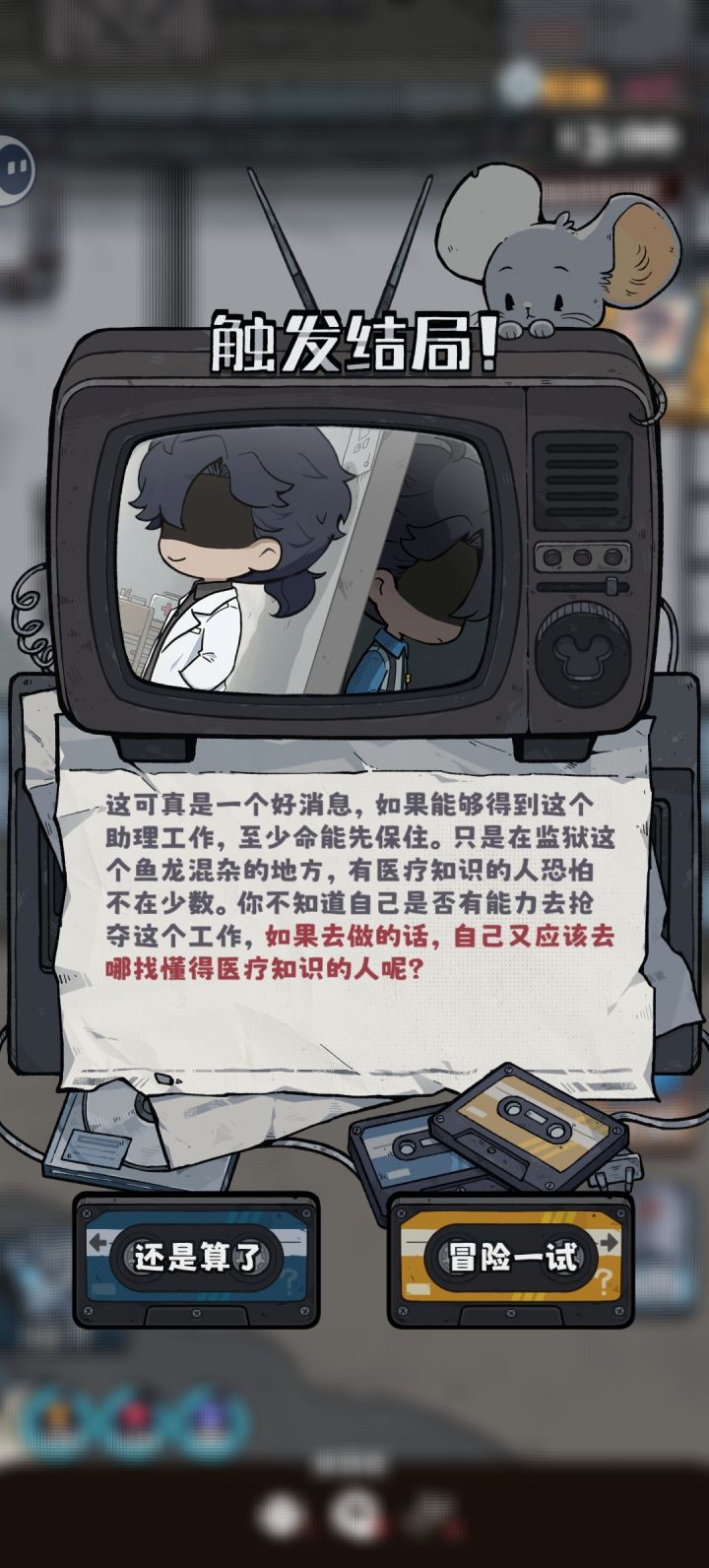 医生好感达到200以上。跟她闲聊,即刻开启任务。这个任务史诗级难度。因为这一本医学心得。用完之后最低。加1%的熟练度。我看到加了1%的熟练度。都想直接使用保释卡离开!!当然这也可能跟兔子的好感度有关。