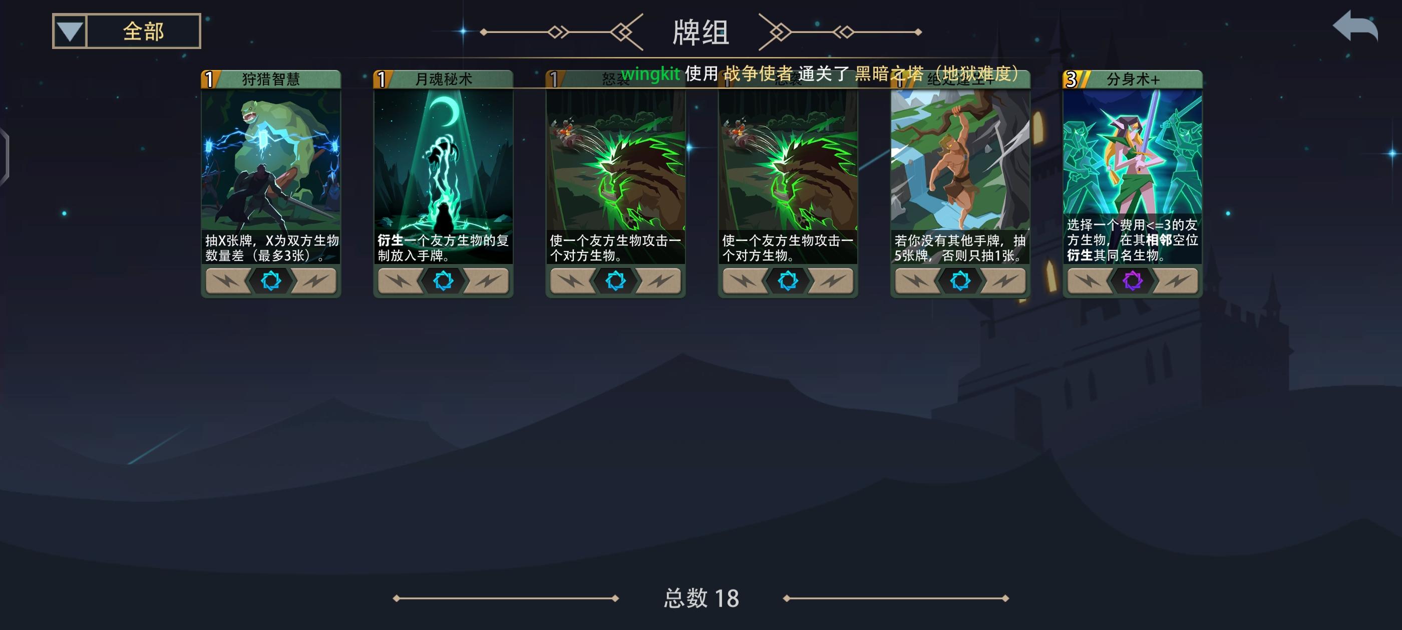 理想卡组:过牌(2~3张)buff卡(3张)生物装备(2~3张)英雄装备(主拿过牌/直伤 3张)卡组厚度(19~21张)