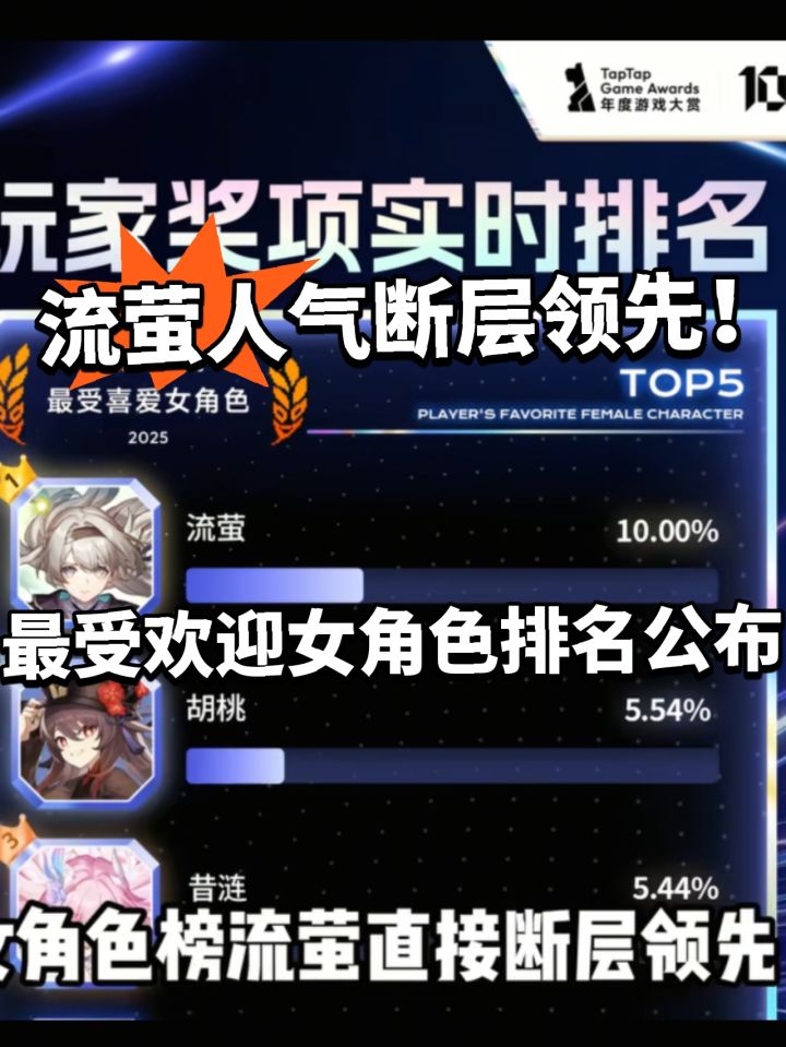 崩铁的流萤直接强势登顶,还创下了断层领先的成绩!她的票数比排名第二、三的胡桃、昔涟多了足足5%,