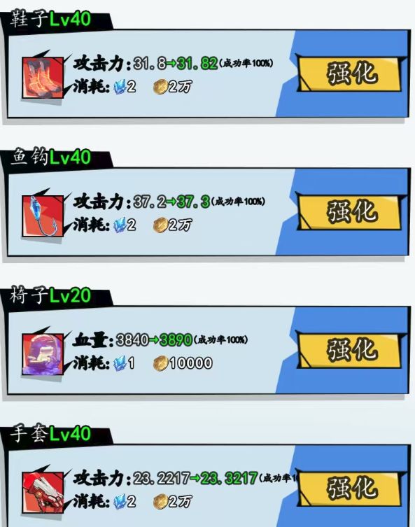 攻击力:【装备】鱼竿,鞋子,鱼钩,手套,浮子升级