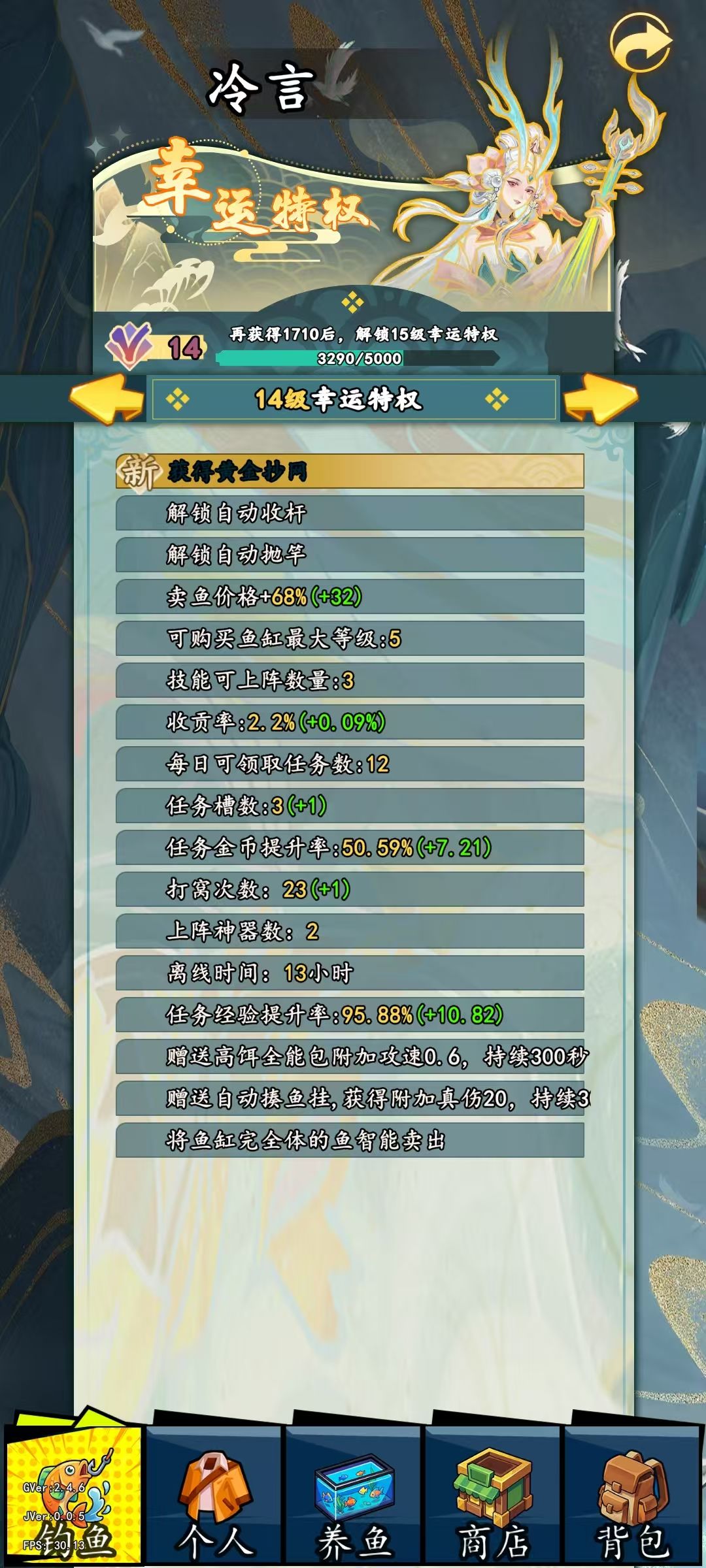 幸运越高,各项特权越高,钓鱼的品质概率越高