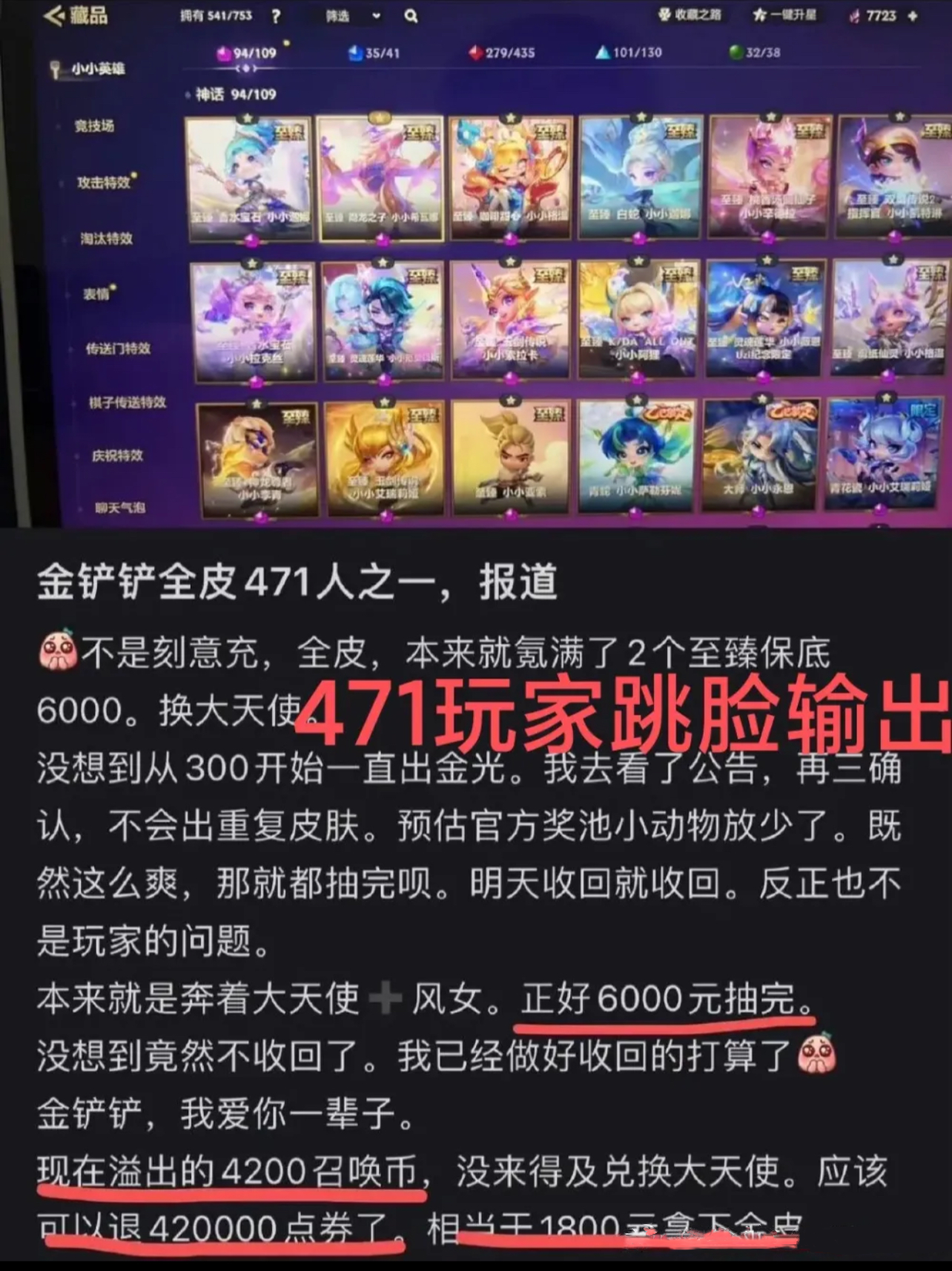金铲铲漏洞补偿到账!471个号薅了4427万,6000元集齐10万毕业装