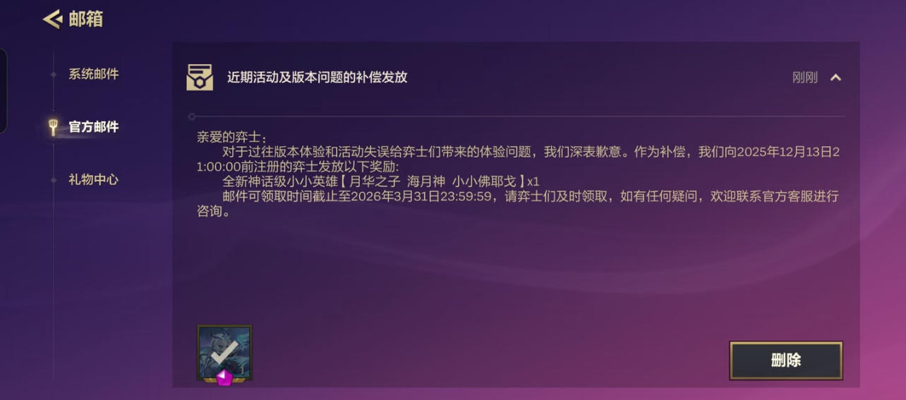 方案是对所有在2025年12月13日21:00前注册的玩家,免费送一个限定神话级小小英雄【月华之子 海月神 小小佛耶戈】,定在2026年1月1日更新后开始发放。