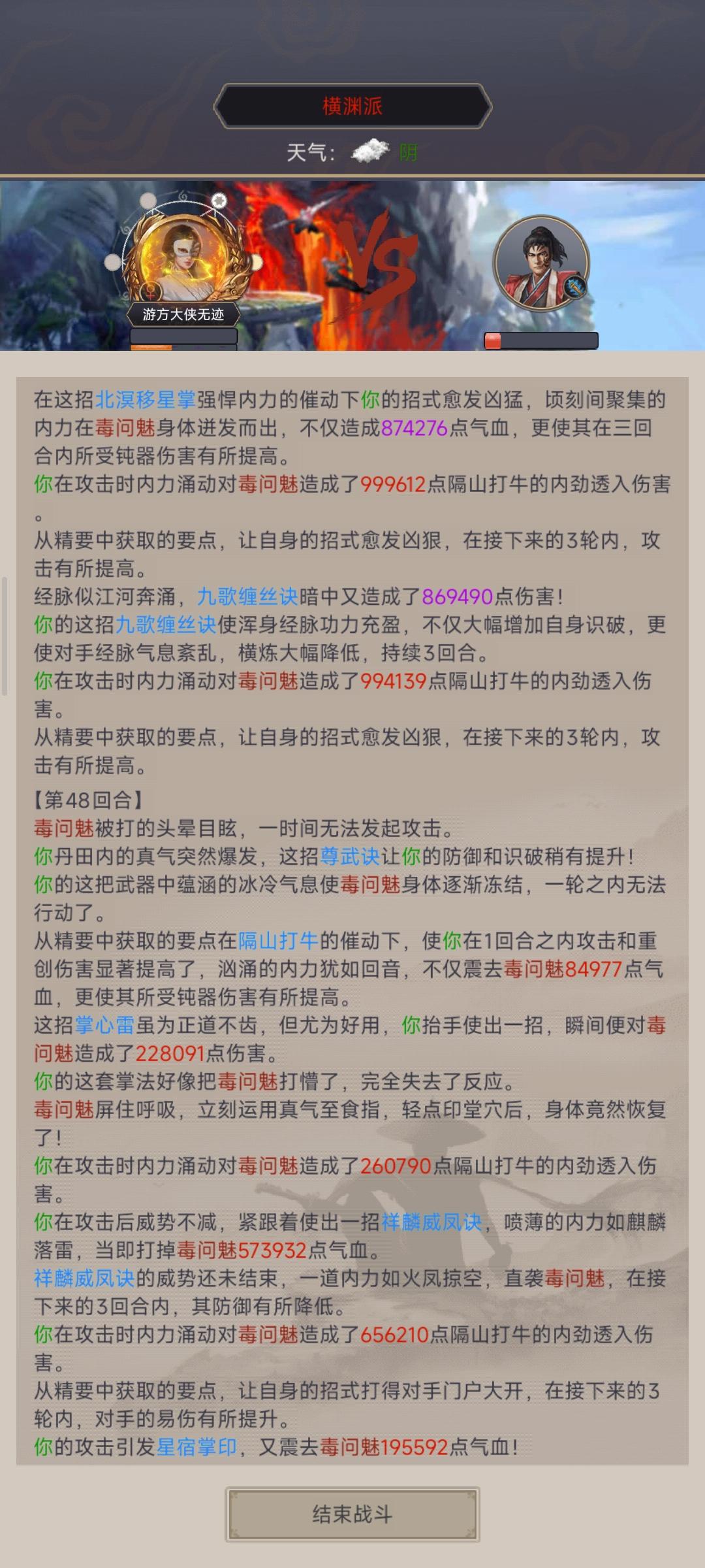 第47回合打出归星掌,北冥不触发星宿,九歌不触发星宿,第48回合祥麟不触发,掌心雷触发