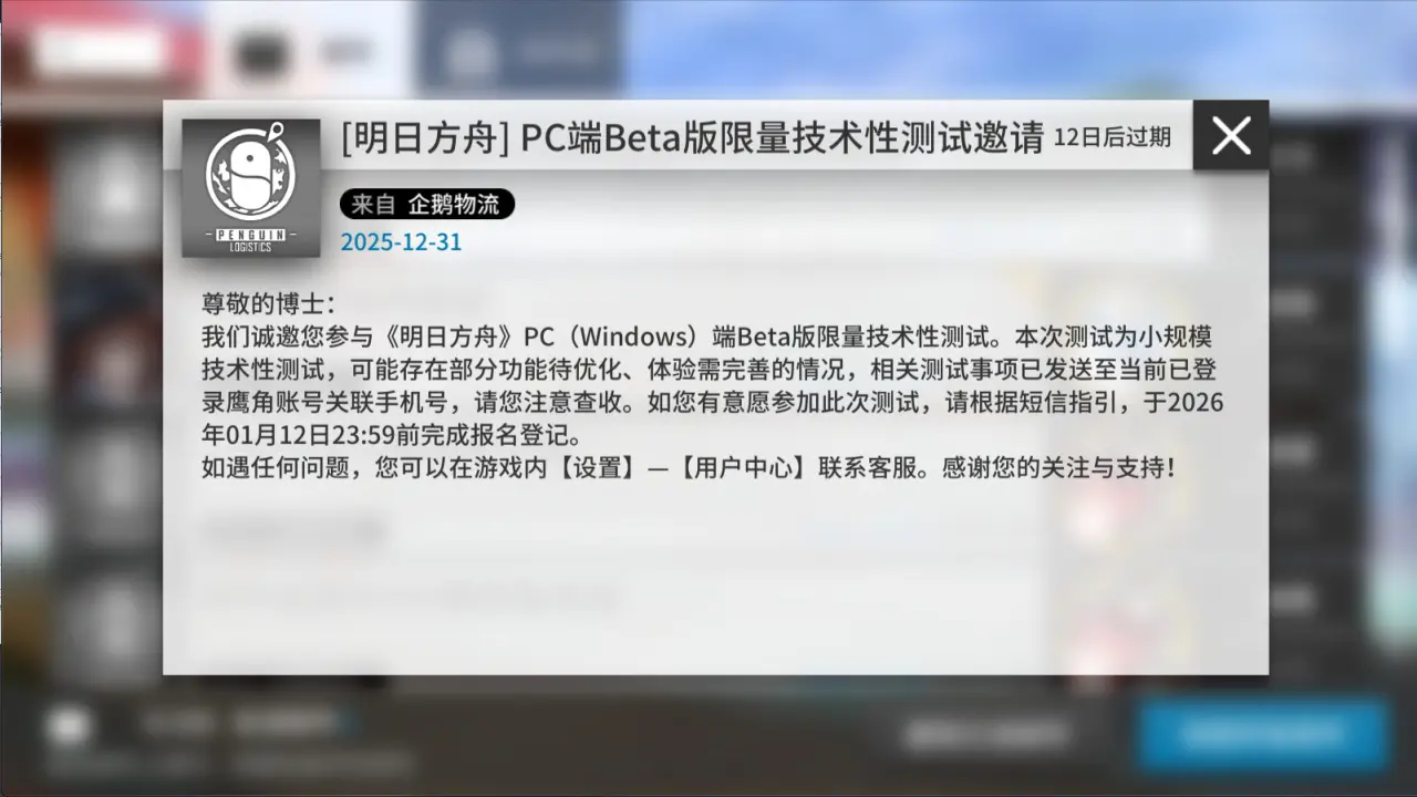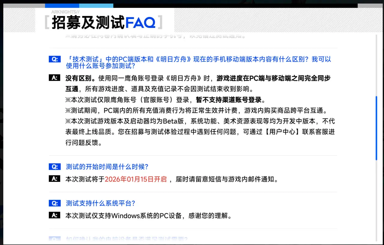 近日,明日方舟官方已向明日方舟部分老玩家发放了PC端限量技术性测试邀请,根据对此次测试的官方描述,本次测试为小规模的技术性测试可能会存在部分功能需要优化、体验需完善的情况玩家可根据短信的指引,在1月12日之前完成报名登记,本次测试将于2026年1月15日开启,目前仅支持Windows系统的PC端,不得不说鹰角是有在看玩家反馈的,玩家反馈明日方舟pc端终于是提上日程了,虽然等了挺久的吧![[TapTap表情|TapFamilyxdoro2_粉狗比心]](https://img.tapimg.com/market/images/101c7e3200596fe8e03765080b467fb8.gif)