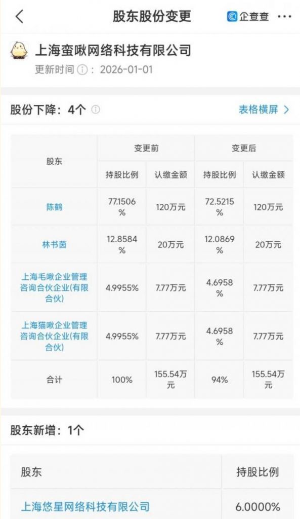 以6%的持股比例,成为了上海蛮啾网络科技有限公司的新股东