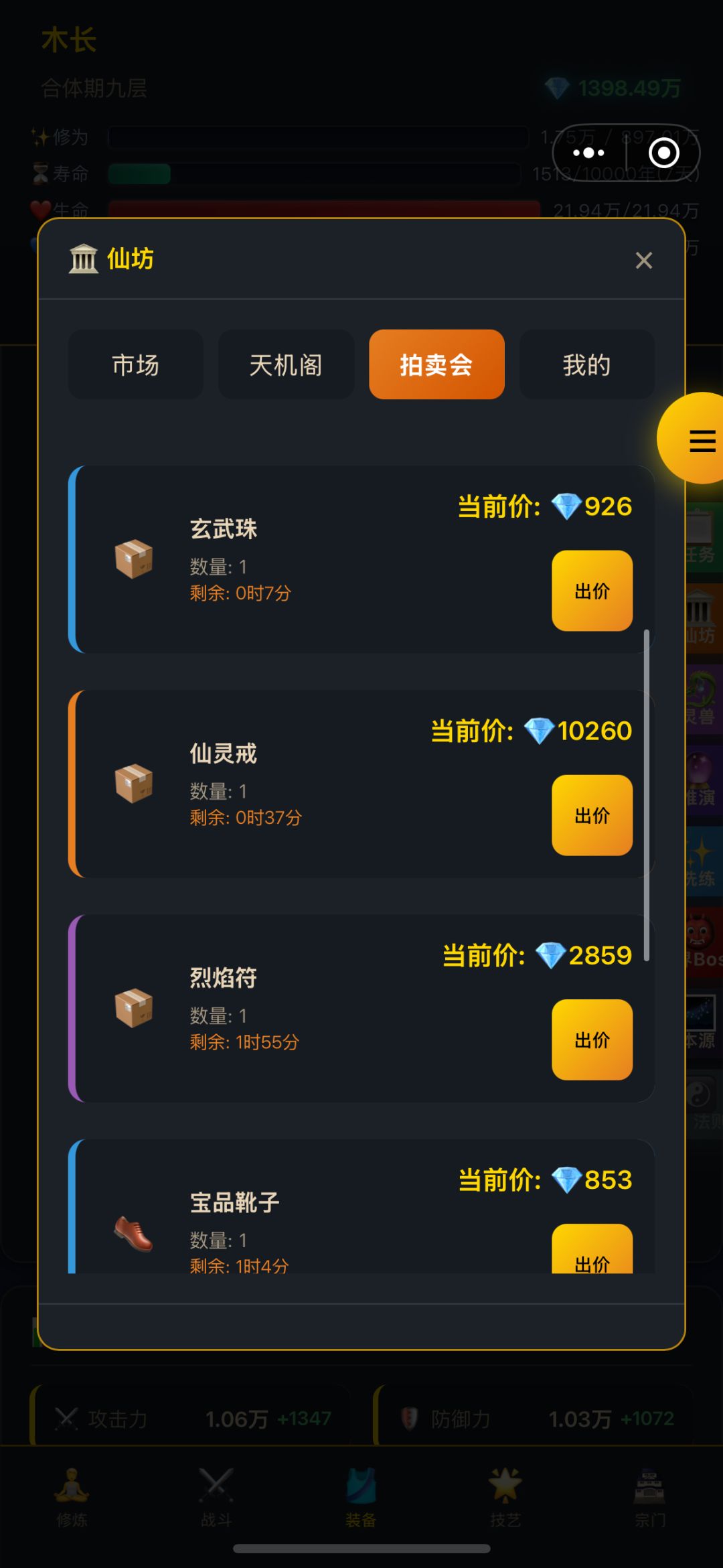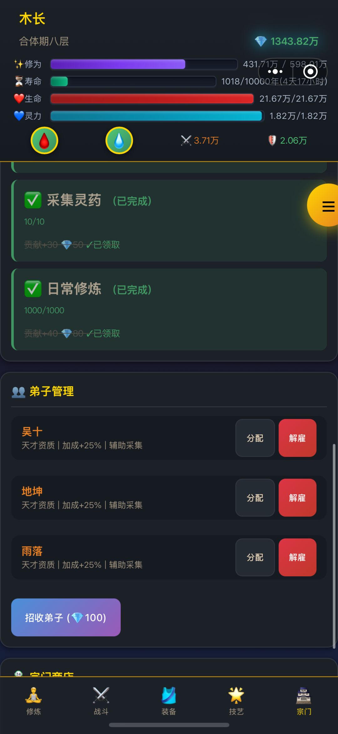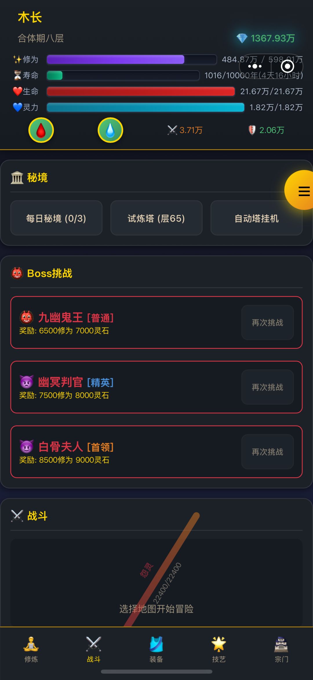 2.修炼 闭关、战斗、秘境、试炼塔、吃培元丹都可以获取修为,前期闭关+战斗可以快速升级,中期试炼塔+磕丹,后期刷地图的boss和推塔