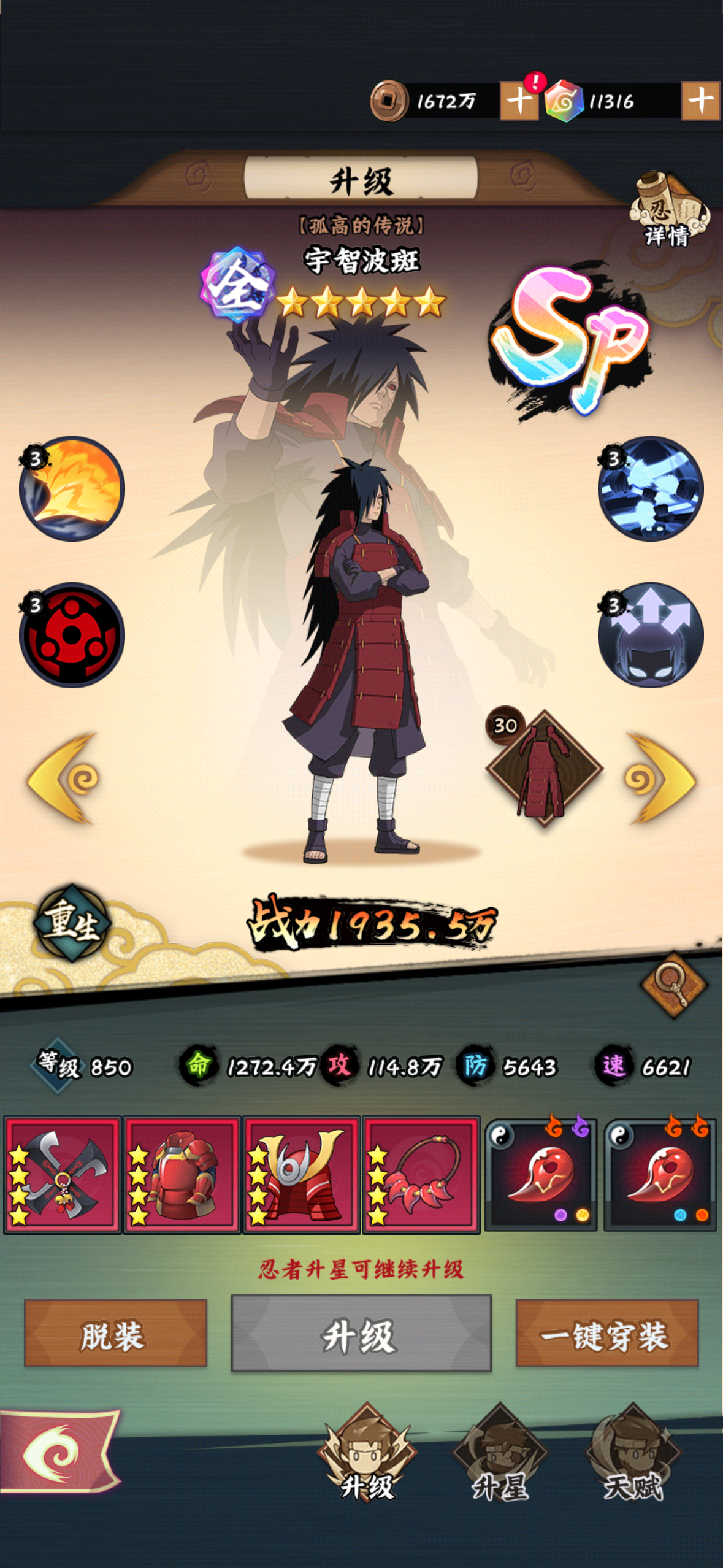 1.目前的想法是SP里我只养“斑”和“初代”这两个. 30斑的输出非常可观,而且可以群体debuff. 就是站场差点意思(洗个影吸收来保证回血),同时搭配更好的阵容. 目的是让依靠初代的高续航,越打越肉越打伤害越高配合斑的须佐平A来打续航.