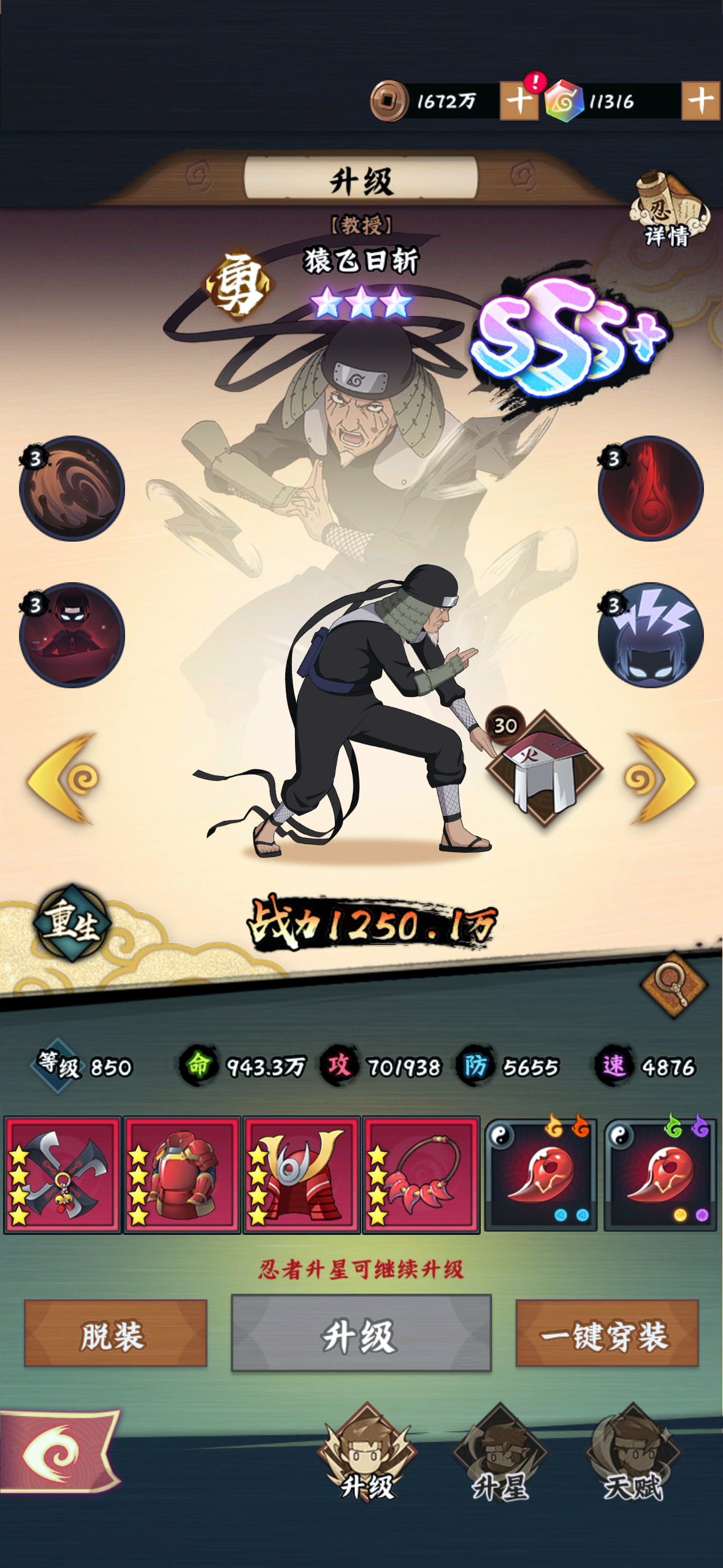 2.因为初代的特性,到了30以后给群体加防御,可以一直叠加,所以我就想到了搭配三代火,三代火只要保证足够肉,让斑和初代可以吃到其余3个人的12%攻击加成就好,这样我的阵容模型就是初代让队伍越来越肉,在保证坦度和续航的同时通过三代火让队伍攻击越来越高. 这到后面就会越打越厉害(三代死后他的攻击加成buff依然存在)