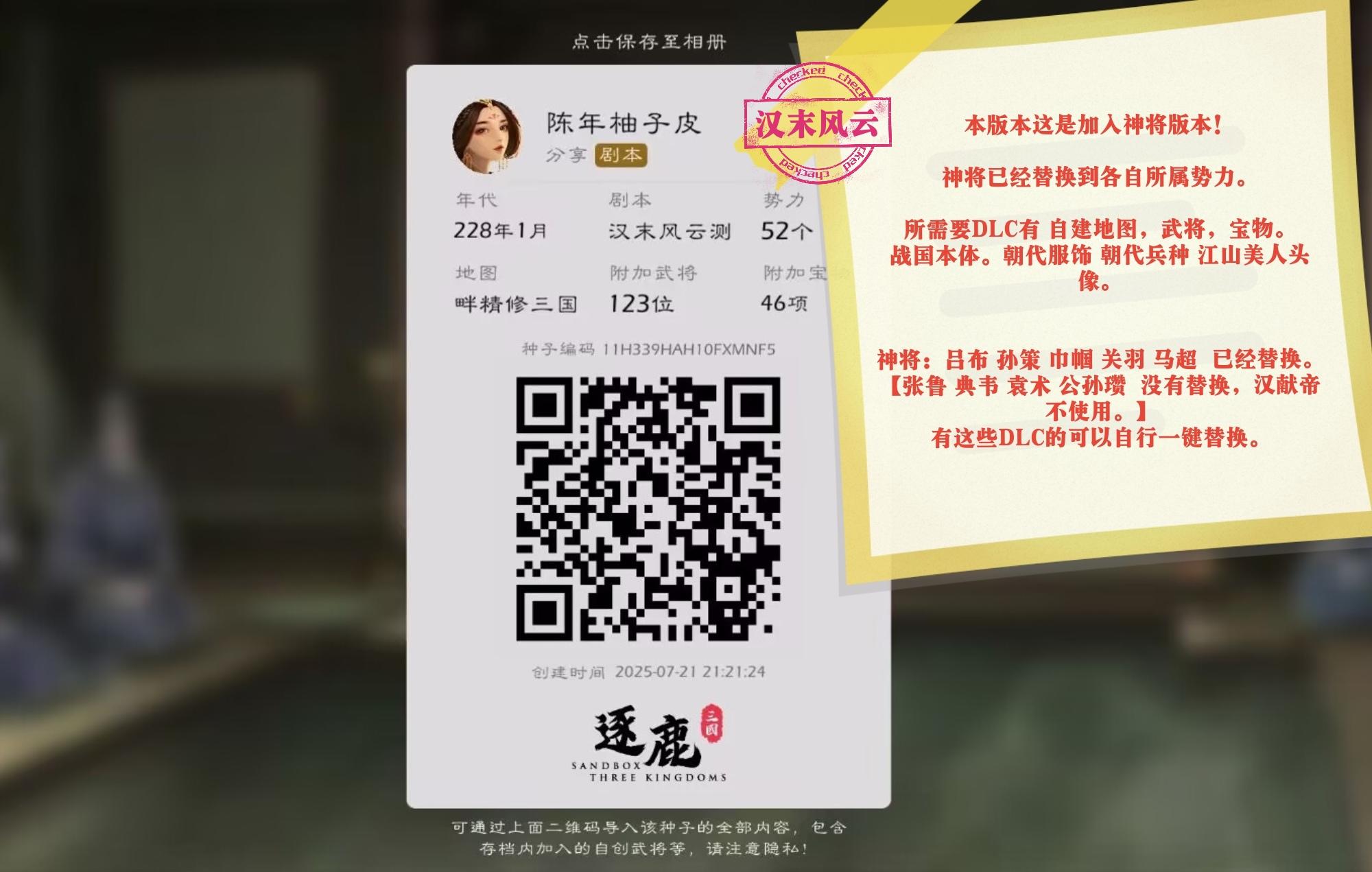 【汉末风云测】剧本,采用的是群雄模式,其中曹孙,刘,袁绍都很强,玩起来没啥难度。建议可以挑一个人少偏僻的势力,异族都加了两个到多个不等的自建武将,比正常武将要强一截,稍次于DLC武将。我的自建武将改了名称,那些强力的自建武将我在名字后面都加了乂以做区分。
