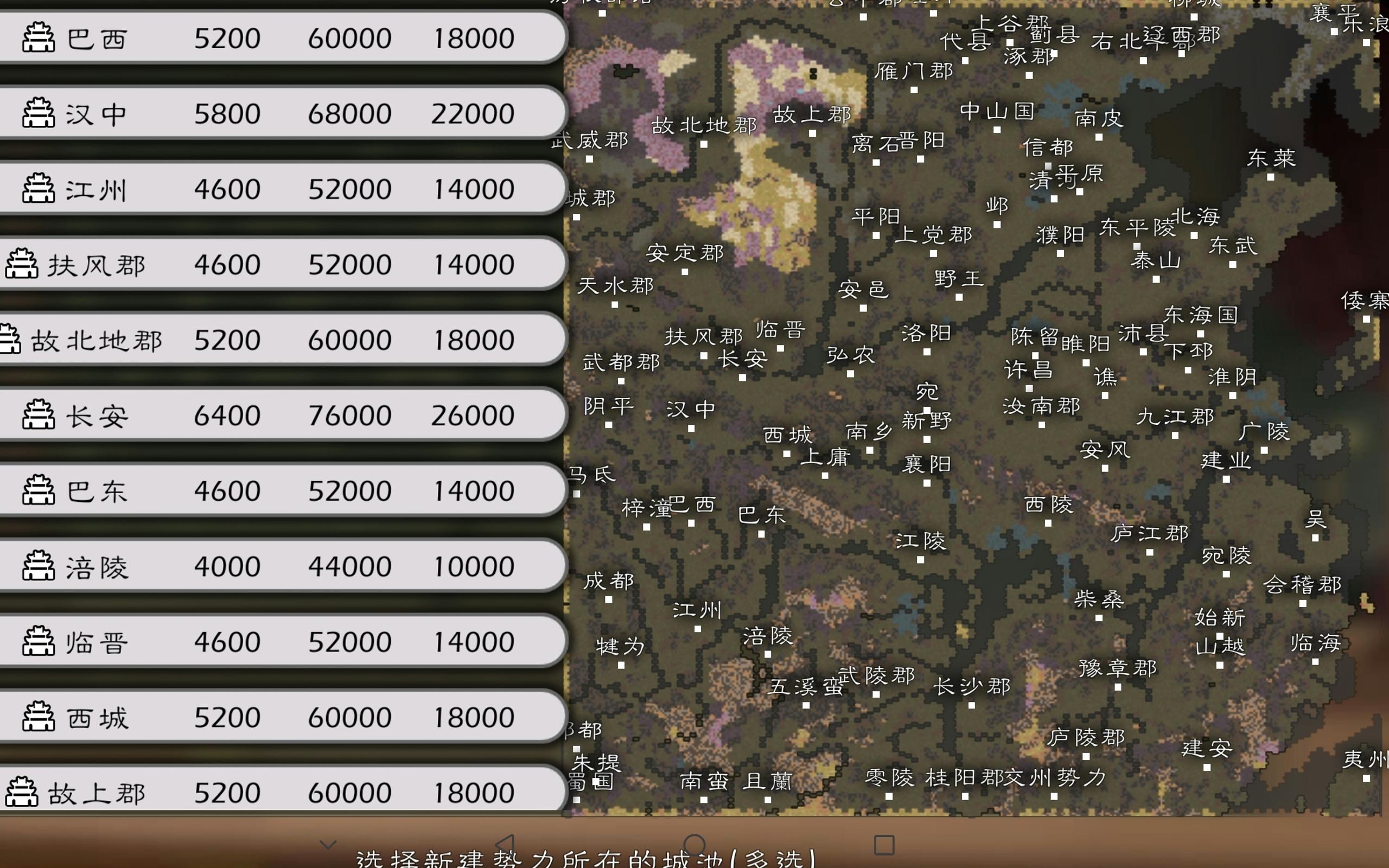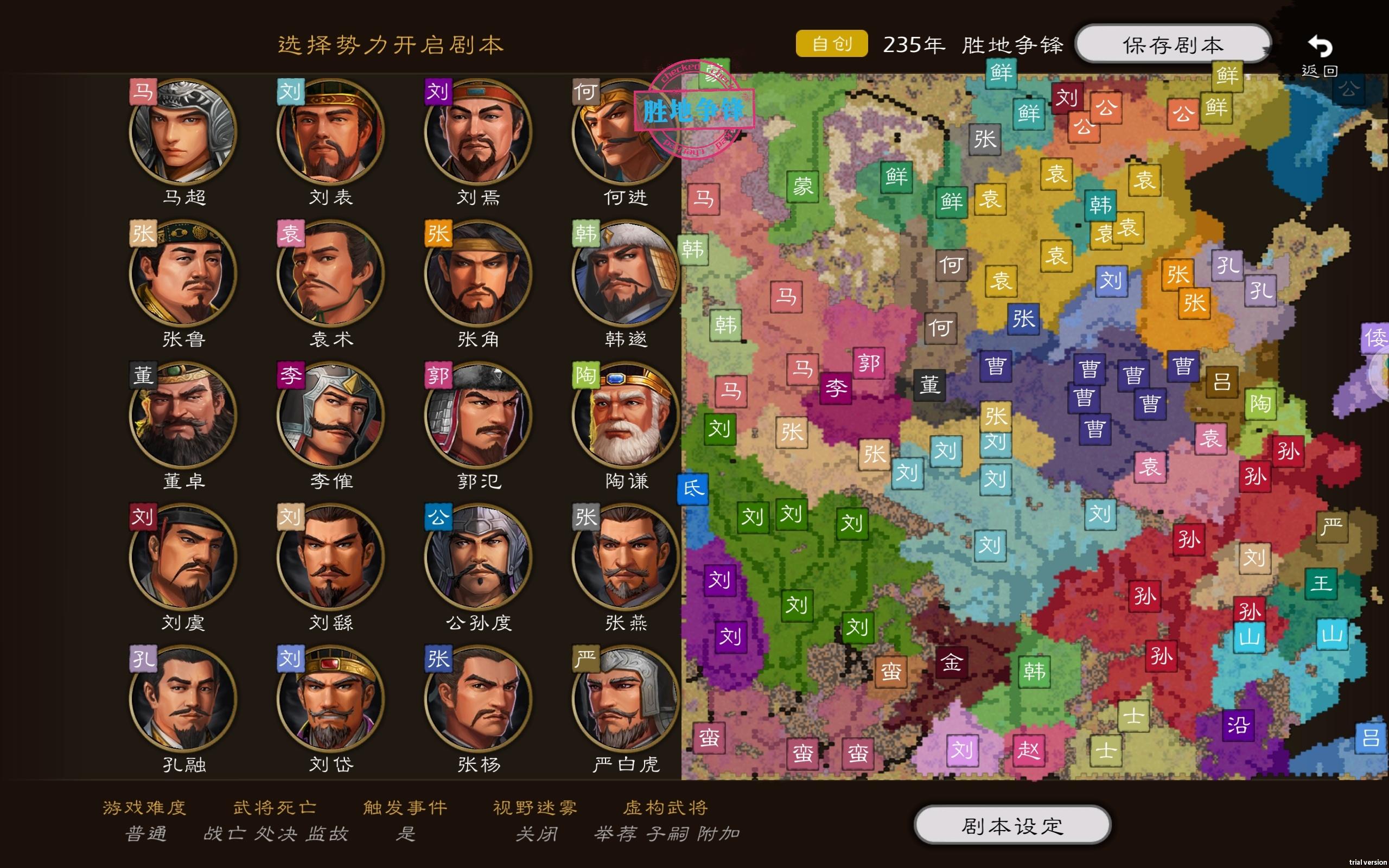 势力范围 和【形胜三国】 剧本保持一致。部分放错势力的武将微调。地形微调。主要是最新修复了东北方向柳城无路可进的窘境!