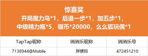 活动参与人数每超过40人,随机抽选1名送出:开局魔力鸟*1,后退一步*1,加五步*1,中级精力瓶*5,银币*20000,么么狐玩偶*1;