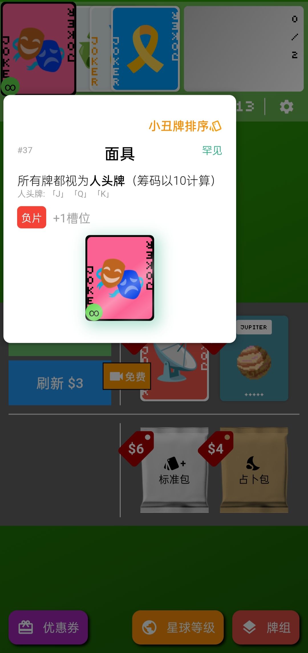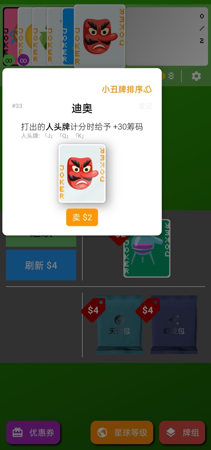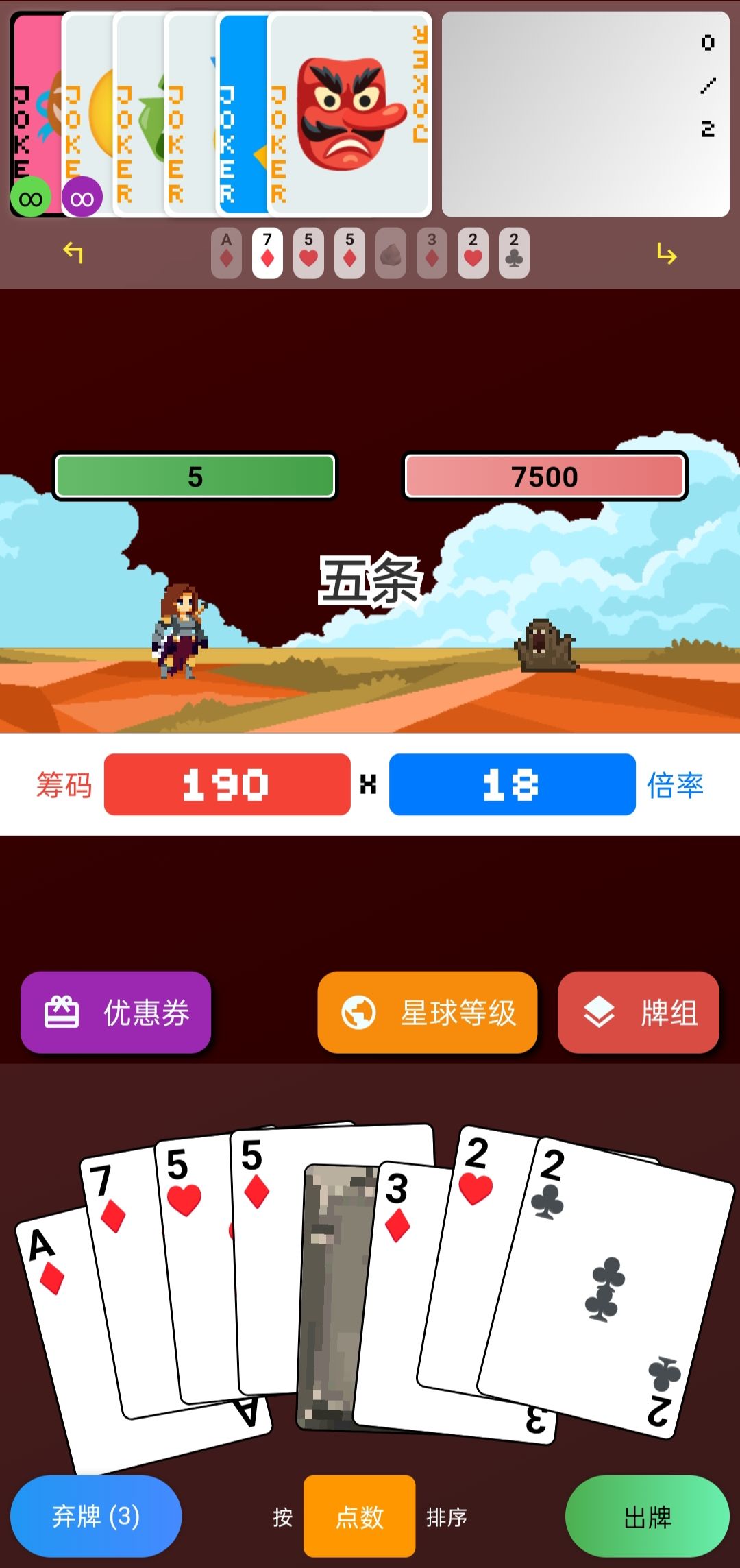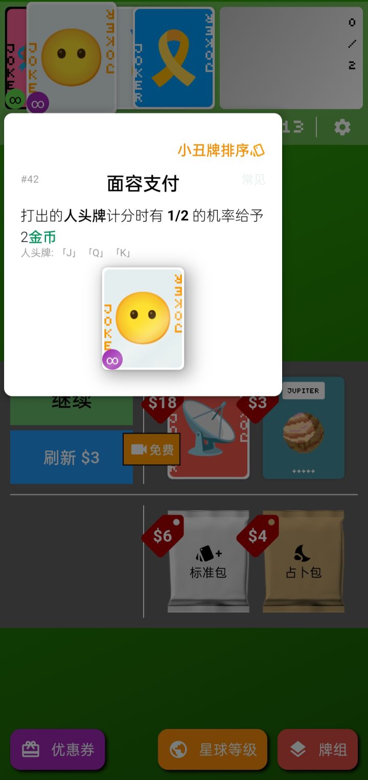 用这几张小丑牌,可以轻松5条,并且都看作为人头牌。这几张牌拿到手没加别的,大概1万伤害。后续通过增加有特殊效果的基础牌,提高牌型,不断变强。