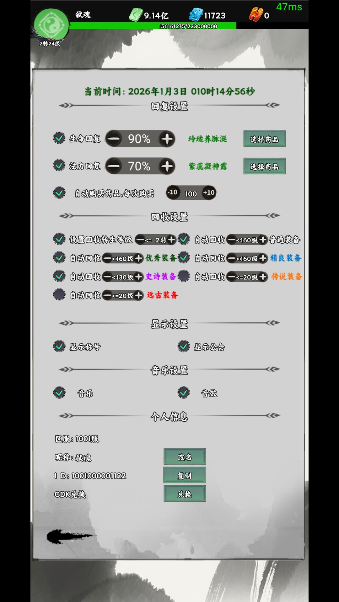 左上角的圆 应该是头像的 目前是各职业的图标 点击可以进入设置 每项的启用需要它左边小圆点一下出现绿色对号 才是生效 这里有药品选择和自动使用时机的设置 自动买药设置 回收装备设置 声音和显示设置等 还有就是自己的名字和游戏ID 和 最最让人喜欢的CDK兑换 每次福利的兑换位置就是这了