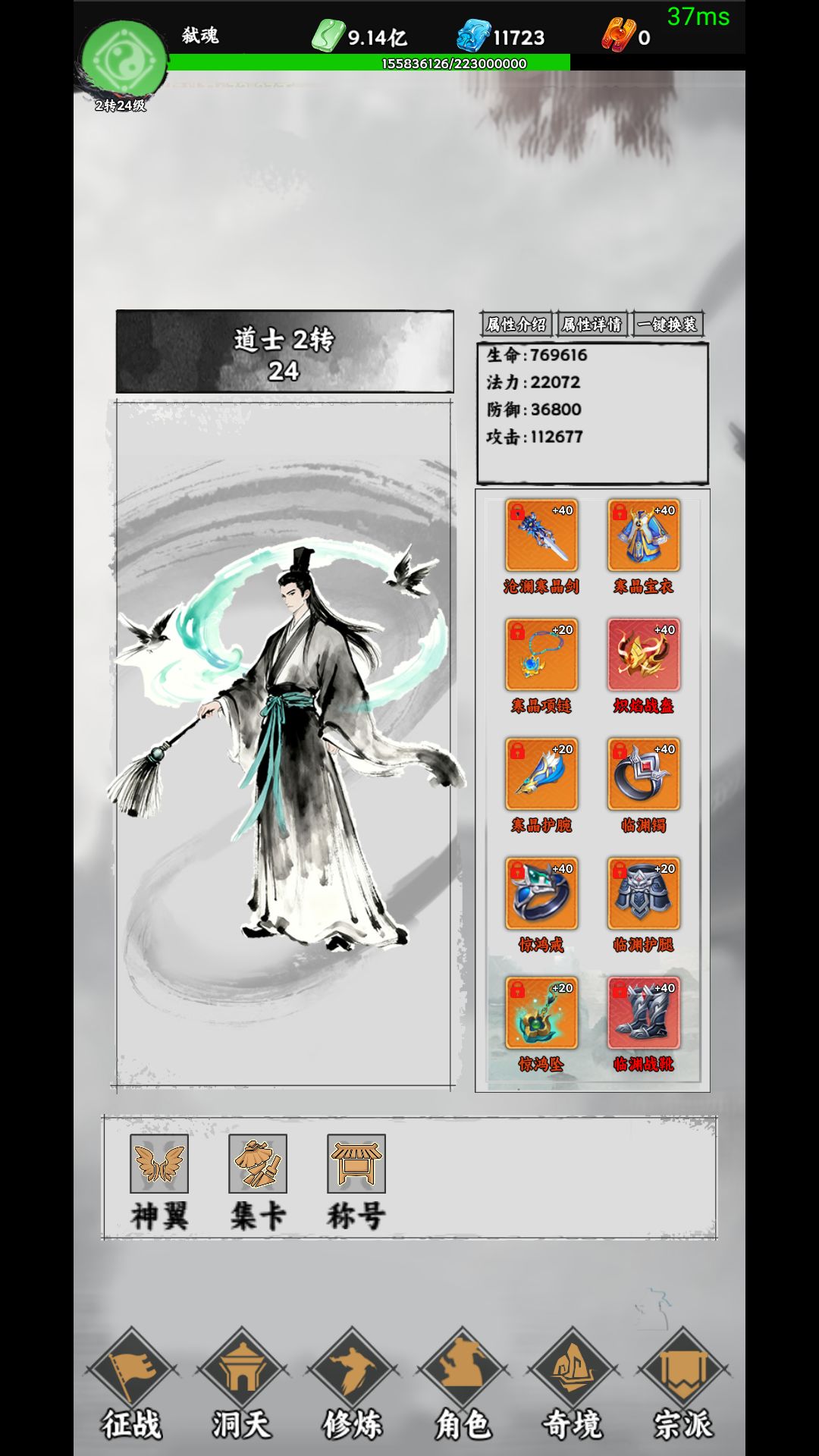 然后是角色功能 可以查看职业 转数和等级 属性 装备 右上角 有个一键换装 可以设置三套装备 一键切换 设置为预案的装备不能被回收